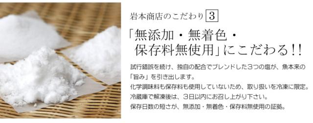 ※1醤油原材料 : 脱脂加工大豆〈遺伝子組換えでない〉、小麦、食塩、砂糖、アルコール※2みりん原材料:米、米麹、醸造アルコール、糖類、食塩●食塩,醤油,みりん(醤油及びみりんは原材料に化学調味料、保存料、着色料、等を使用していない醤油、みりんを使用しております),砂糖のみを使用し、それらの調味料を当店独自の方法で調整、調合して味付けしております。他の化学調味料、保存料、合成着色料等は一切使用しておりません。全て手作業、手造りで製造した、当店自慢の定番人気商品のセットです。