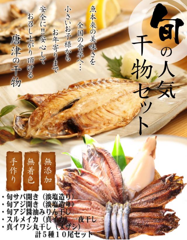 【送料無料】敬老の日 ギフト 限定企画 グルメ大賞受賞 唐津産 無添加 5種10尾 旬の干物セット 旬サバ開き 旬アジ開き2種 プレゼント 佐賀 呼子 イカ スルメイカ一夜干し イワシ丸干 干物 ひもの セット 敬老の日 プレゼント