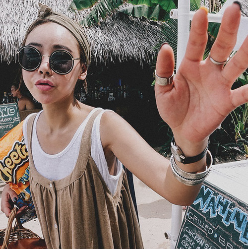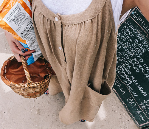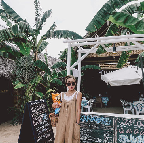 大きなポケットがポイントのシンプルなリネンオールインワンは、トレンドのワイドパンツでこなれ感をプラス。