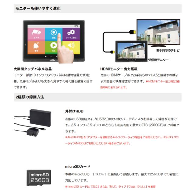 防犯カメラ ワイヤレス 家庭用 タッチパネルモニター SDカード録画 AFH-101 オルタプラス Alter+ キャロットシステムズ