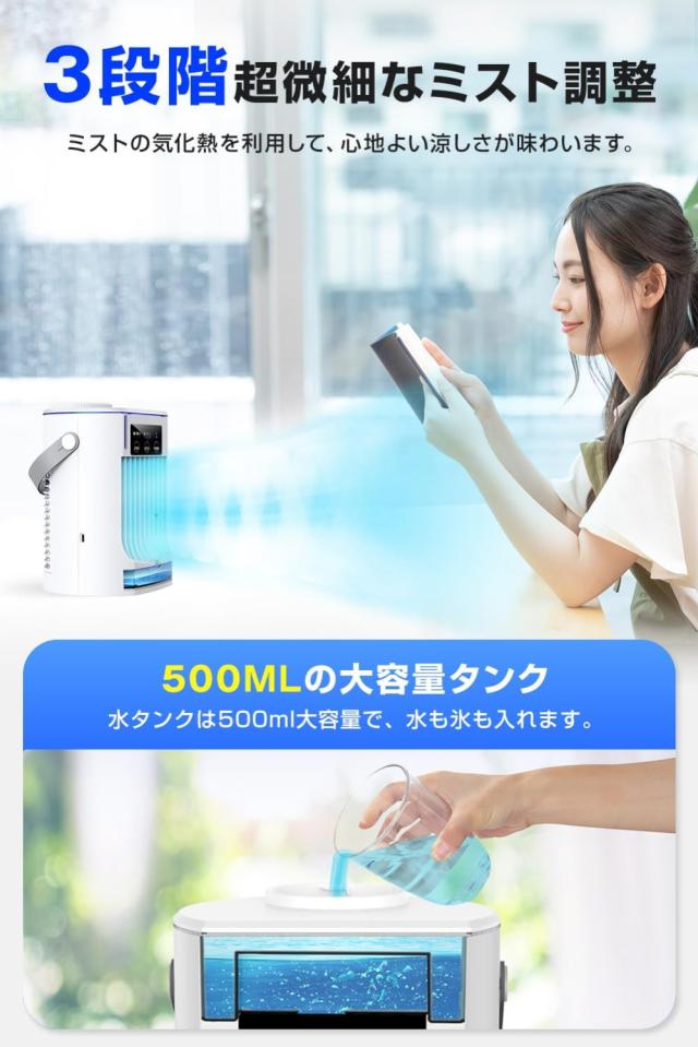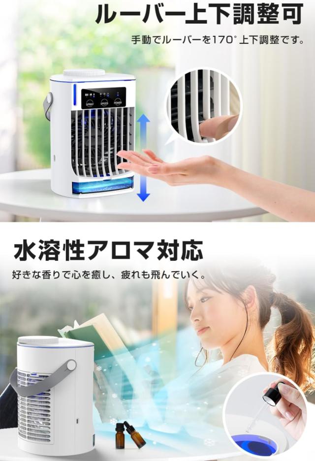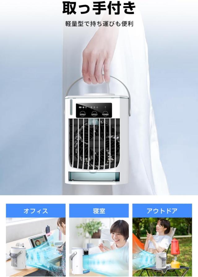 【コンパクト・操作簡単】コンパクトデザインな冷風機。幅16×高さ21.5×奥行13cmの卓上サイズ、手提げ付きで好きな場所で使用できます。水タンクは500mlの大容量で、水も氷も入れれます。上部から給水、水漏れ防止できる卓上冷風機です。操作簡単でタッチするだけON・OFFなどできます。キッチン、リビング、洗面台、車中泊、キャンプのテント内様々などシーンで活躍できます。