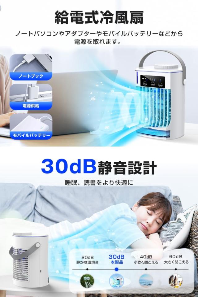 【USB給電式・電気代節約】ミニ冷風機はUSB電源を利用しております。 アダプター、パソコンやモバイルバッテリーなどで給電が可能です。省エネ、環境にも優しい冷風扇です。
