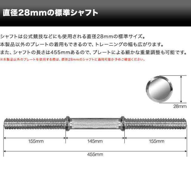 | サイズ | ・2.5kg : (約)直径16.5cm×厚さ2.5cm ・1.25kg : (約)直径12.5cm×厚さ2cm ・シャフト : (約)直径2.8cm×長さ45.5cm ・ハードロックカラー : (約)直径5.5cm×厚さ2.2cm |