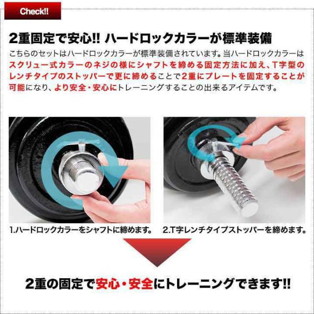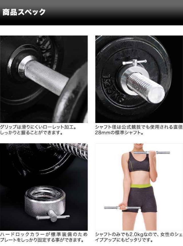 | セット内容 | ・プレート2.5kg×8 ・プレート1.25kg×4 ・シャフト2.0kg×2 ・ハードロックカラー0.18kg×4 |