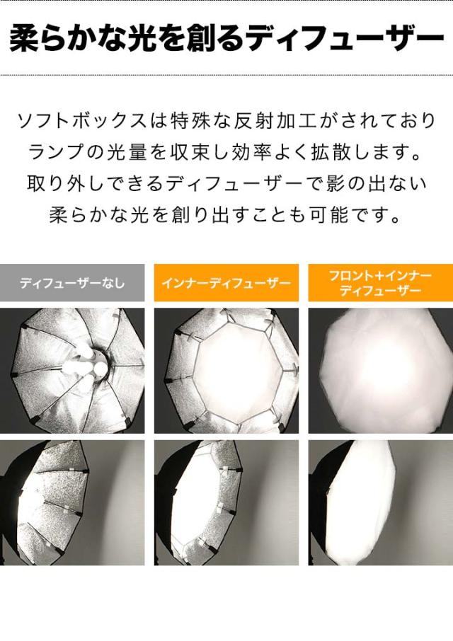 | セット内容: 専用スタンド/オクタゴンランプユニット(5灯ソケット)・電源コード(約3m)/ソフトボックス・フロントディフューザー・インナーディフューザー・ソフトボックスケース ※商品に電球は付属しません。 |