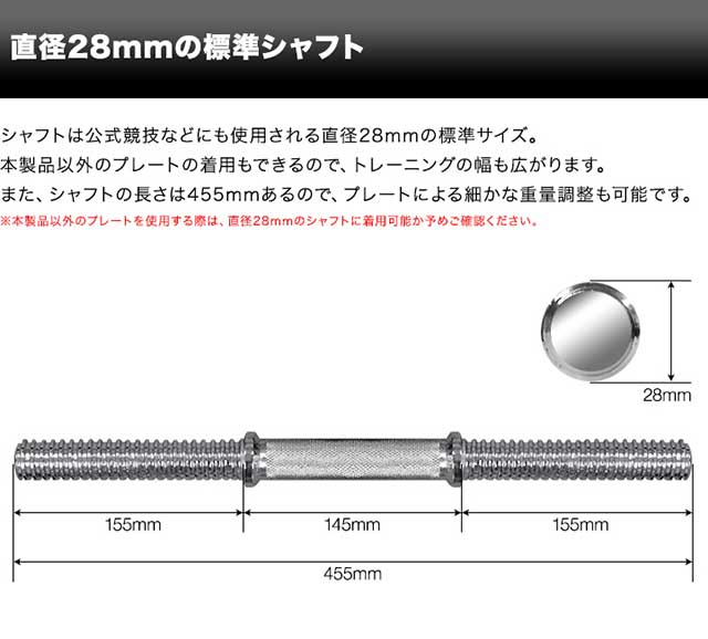 | サイズ | ・2.5kg : (約)直径16.5cm×厚さ2.5cm ・1.25kg : (約)直径12.5cm×厚さ2cm ・シャフト : (約)直径2.8cm×長さ45.5cm ・ハードロックカラー : (約)直径5.5cm×厚さ2.2cm |