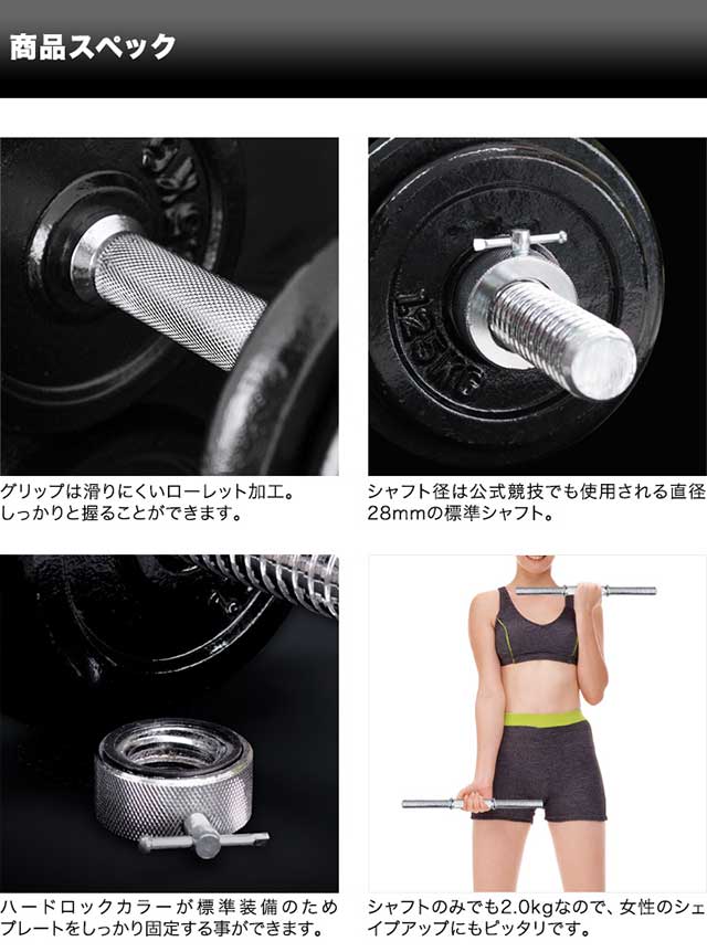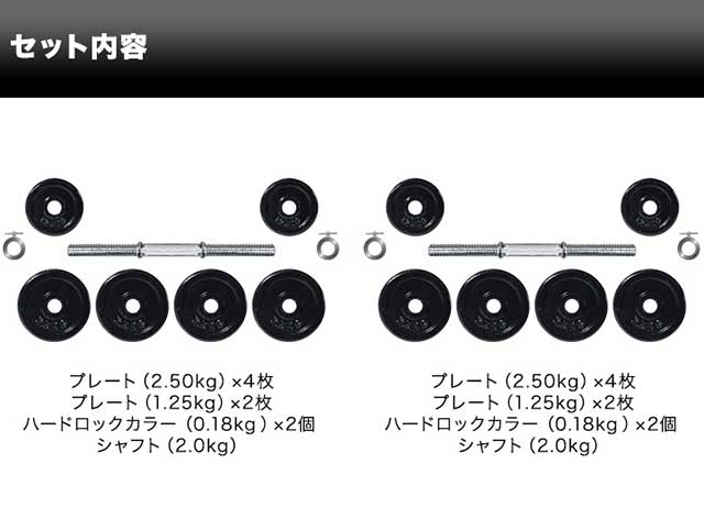 | セット内容 | ・プレート2.5kg×8 ・プレート1.25kg×4 ・シャフト2.0kg×2 ・ハードロックカラー0.18kg×4 ・2.5kgプレート用ラバーリング×8 ・1.25kgプレート用ラバーリング×4 |
