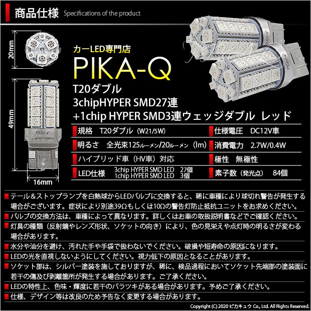 | 商品名 | SUBARU IMPREZA SPORT[GP系](GP2/GP3/GP6/GP7)対応 テール&ストップランプ用LEDバルブ T20ダブル HYPER SMD 30連ウェッジダブル球 LEDカラー:レッド 1セット2個入り | |||