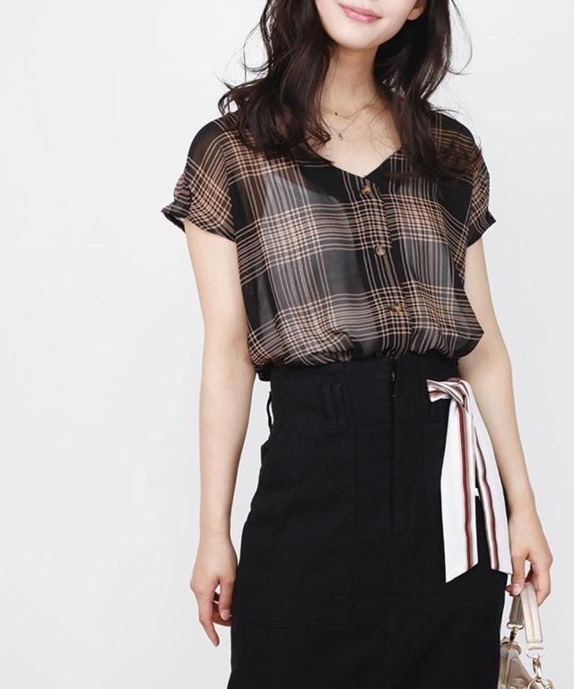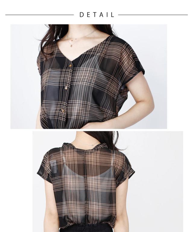 シアーチェックシフォンブラウス ブラウス レディース シフォン シアー 透け感 トップス 春 夏 チェック Vネック 春 夏 【BELL】