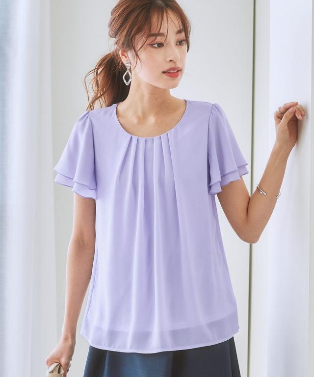 胸元のタックと揺れるフレア2枚袖がシンプルながらも大人可愛く1枚で着映えます!肌触りのよいカットソー裏地付きで下着が透けにくく安心です。UVカット機能も付いているのでこれからの季節にうれしいアイテム