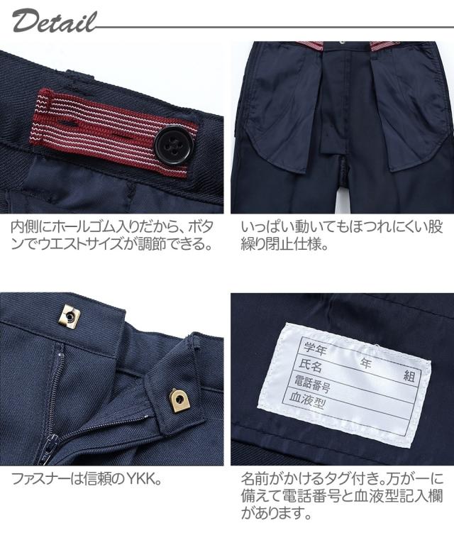 品質=ポリエステル100%(織物 ツイル) カギホック開き 前ファスナー ボタンホール付ゴム入(ウエスト調節可) ポケット:前2・後2 名前の書けるネーム付。 ※ウエストは最大寸法ですので調節ゴムを縮めてご使用ください。 原産国:中国製 洗濯表示:洗濯機OK ネット使用