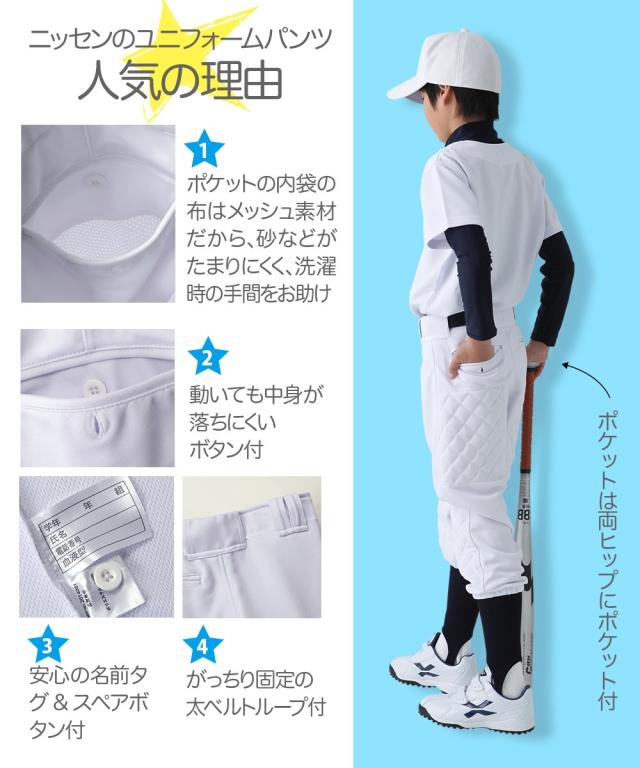 キッズ 野球 パンツ キルト付 子供服 ジュニア服 サイズ スポーツウェア 白 身長120〜170cm ニッセン nissen