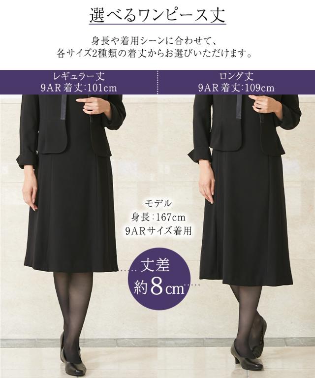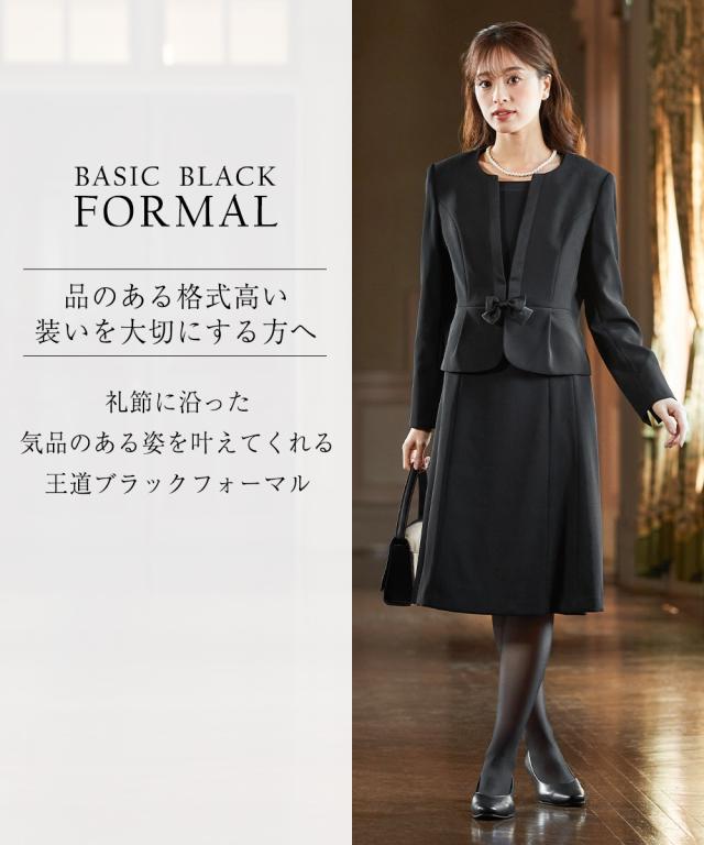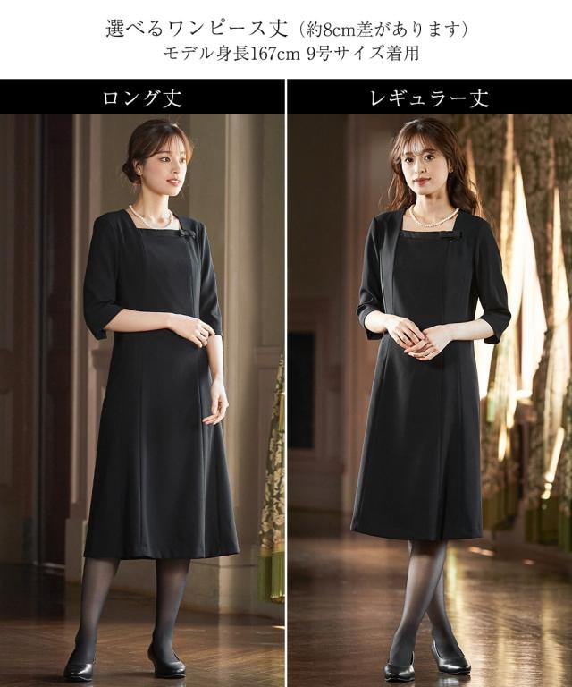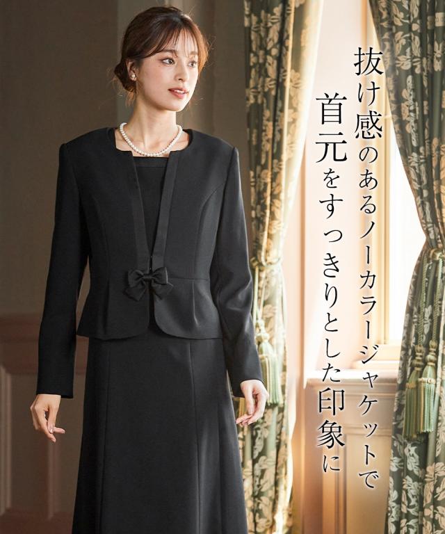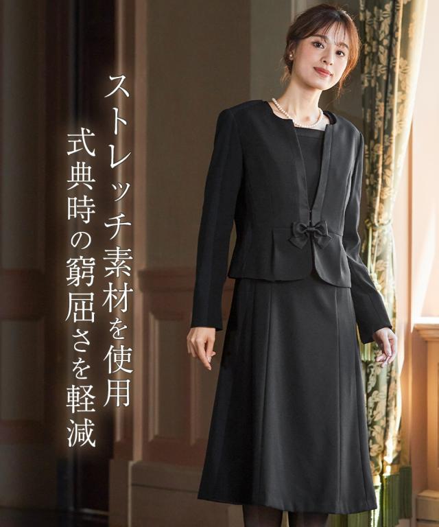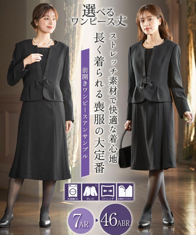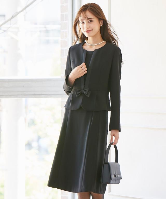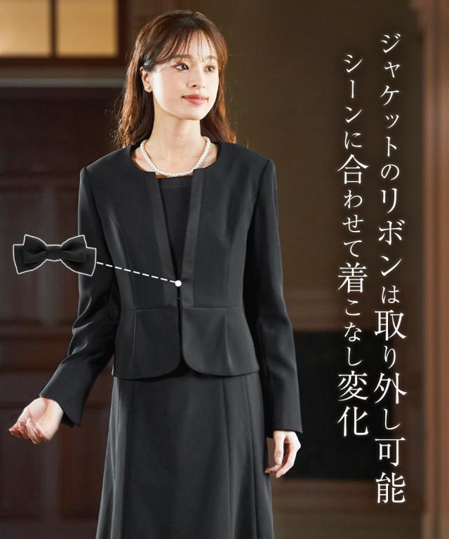 喪服 礼服 アンサンブル スーツ 選べるワンピ丈 レギュラー/ロング 大きいサイズ レディース 21〜46号 ノーカラージャケット + 前開き7分袖ワンピース リボンブローチ付 ブラック フォーマル 黒 オールシーズン ニッセン nissen