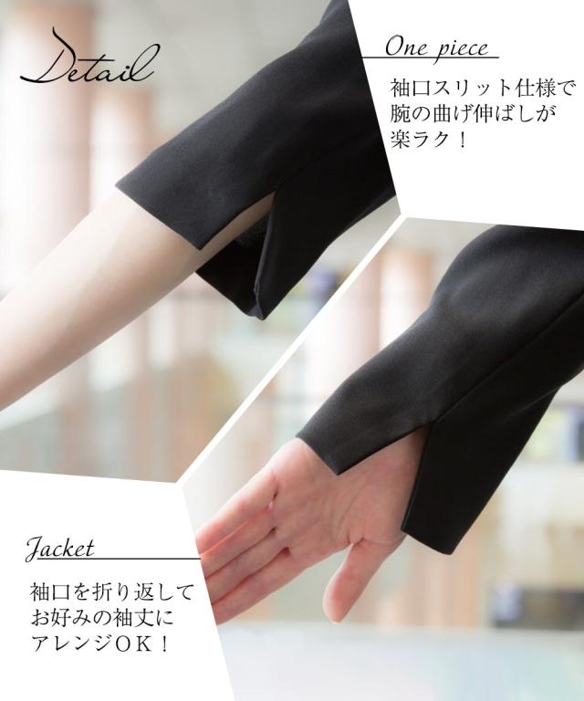 リボンが愛らしいノーカラージャケットに、ベーシックな7分袖ワンピースのアンサンブル。横方向にのびて動きやすく、脱ぎ着もしやすいストレッチ生地。ワンピースは前開きで着脱スムーズなのも嬉しい。ジャケットの袖も、すっきり見えるこだわり設計を施しています!