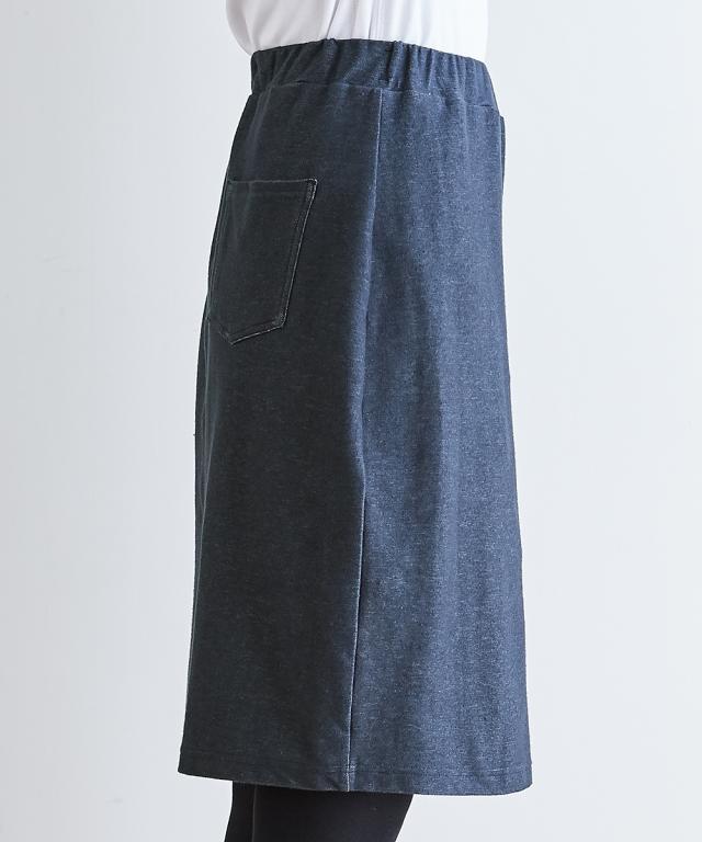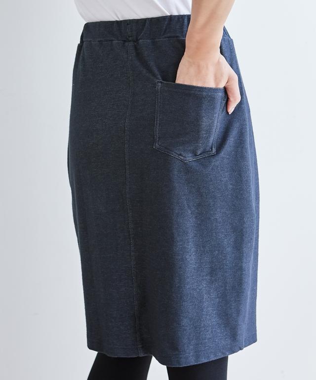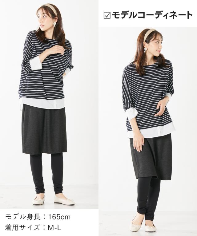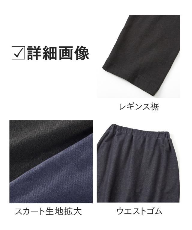 スカート総丈(約)=全サイズ共通56cm 股下寸法(約)=全サイズ共通72cm品質=スカート部:綿55% ポリエステル40% ポリウレタン5%(デニムニット) レギンス部:綿95% ポリウレタン5%(ストレッチ天竺) 原産国:中国製
