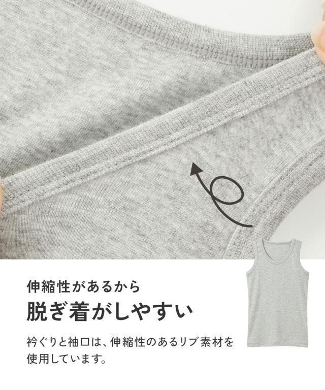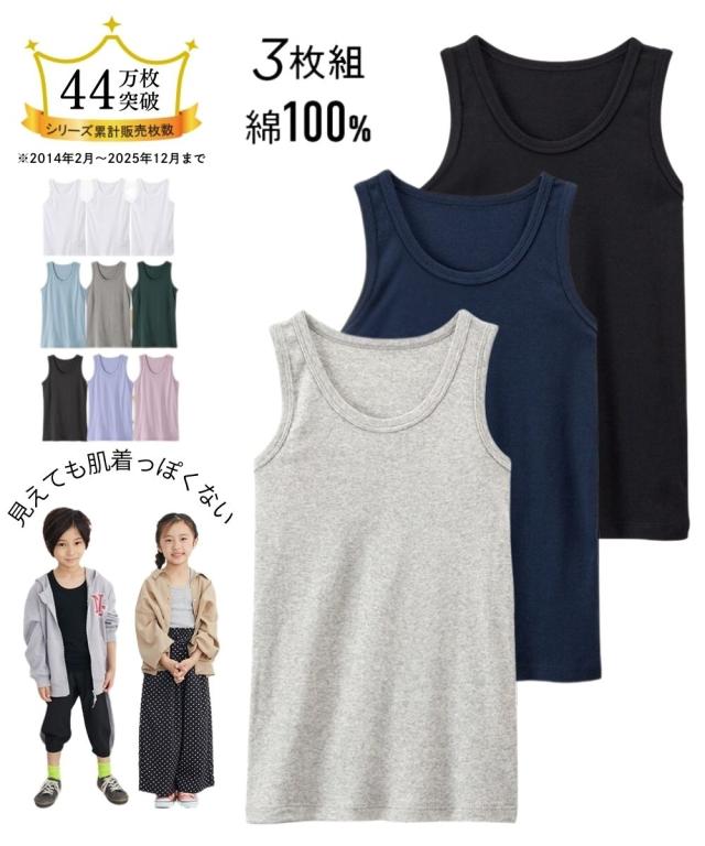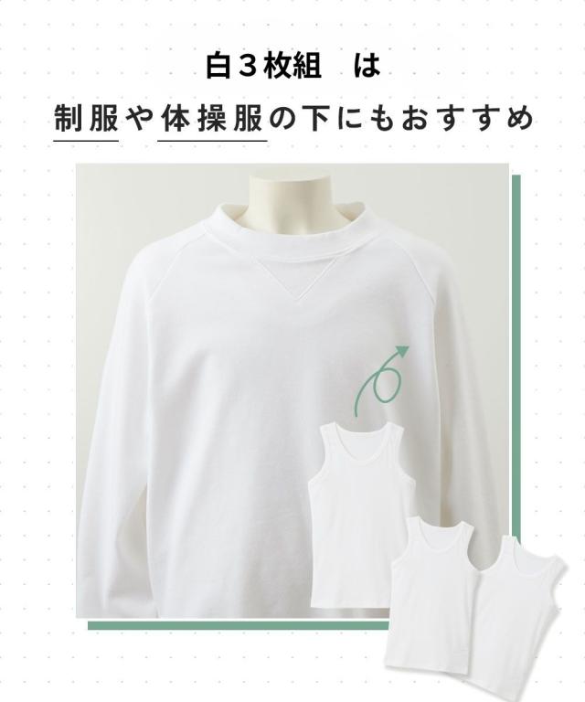 [keyword] 子供服 子供用品 ノースリーブ おしゃれ 綿100% 素材 無地 無地調 柄 かわいい 男の子 男 男児 キッズ 小学生 中学生 高校生 お買い得セット まとめ買い セット お得 [comment] シリーズ累計販売枚数37万枚突破。 1年中愛用できるシンプルなタンクトップ。 コーデが楽しめるカラー系3枚組と制服や体操服の下におすすめの白3枚組が新しく入荷しました〜うれしいポイント〜 ■POINT1 綿100%素材 毎日着るものだから肌にやさしく、着ごこちのいい綿100%素材にこだわりました。 肌が敏感なお子様にもおすすめです。 ■POINT2 見えても見せてもOKな色 ・モノトーン系(杢グレー+紺+黒) ・カラー系(ミント+ラベンダー+黒) ちらっと見えても下着っぽく見えません。 はおりものやトレーナーからちらっと見せてもOKですよ ■POINT3 女の子も男の子も着用OK ■POINT4 長めの着丈 背中やお腹が出にくいように長めの着丈に設計しました。 元気に動き回るお子様も安心ですね。 ■POINT5 衿ぐり丈夫設計 小さなお子様でも脱ぎ着がしやすいように衿ぐりと袖口は伸縮性のあるリブ生地を使用しています。