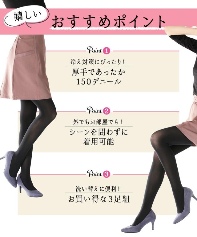 しっかり厚手であったか。防寒対策にぴったりの150デニールタイツ。お客様の声にお応えして、ずれ落ちにくい設計に改良しました。毎日使いたいものだから、まとめ買いでお得にGET!両面マチ付ではきやすさも◎