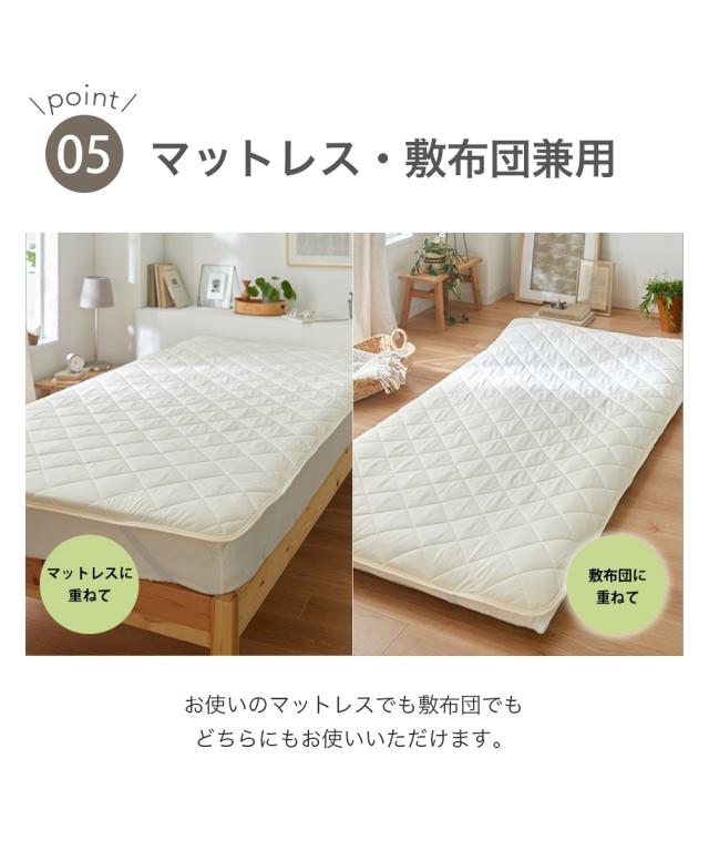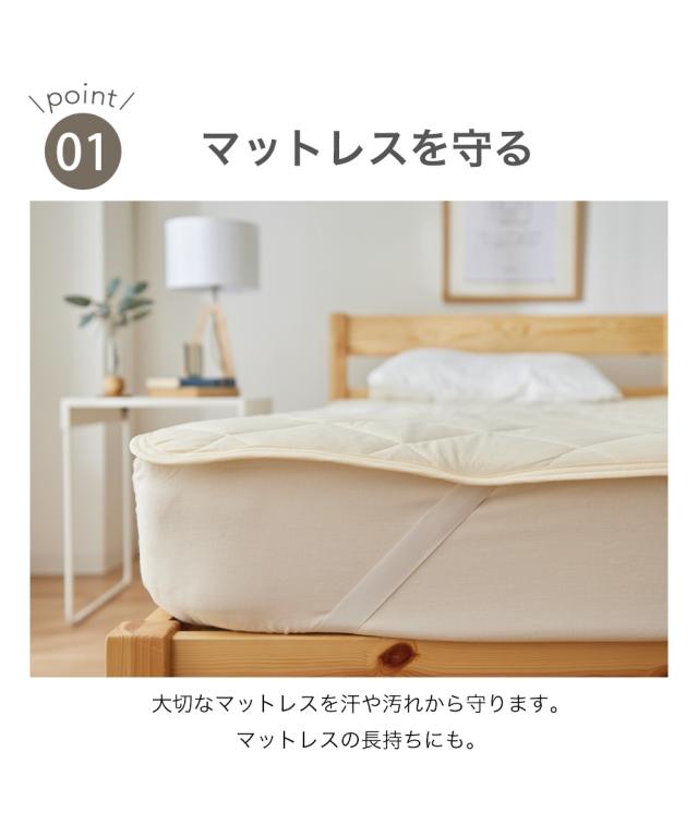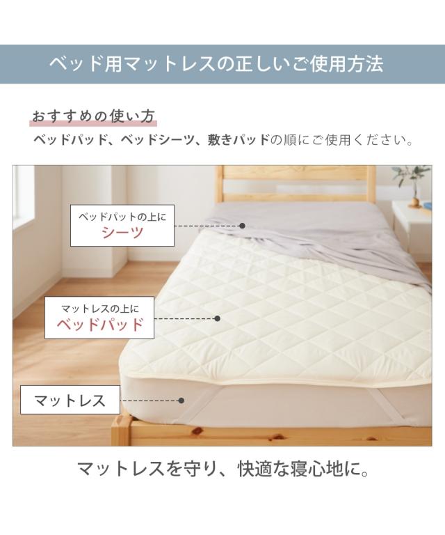 [keyword] 家具 収納 インテリア 洗濯機洗いOK 洗濯 吸汗速乾 乾きやすい 無地 無地調 柄 かわいい おしゃれ シンプル ベーシック 定番 [comment] [keyword] 家具 収納 インテリア 洗濯機洗いOK 洗濯 吸汗速乾 乾きやすい 無地 無地調 柄 かわいい おしゃれ シンプル ベーシック 定番 [comment]マットレスを汗や汚れから守る!汗取りベッドパッド機能にあわせて価格もこだわったロングセラーのマットレスプロテクター 「ベッドパッドを使っていますか?」 ●ベッドパッドとは? マットレスとシーツの間に敷いて使用する寝具。マットレスプロテクターと呼ばれることもあります。一般的に寝汗や睡眠時の汚れを防止したり、寝心地を改善したりする等、目的によって様々なタイプがあります。汚れてもマットレスが洗えない分、睡眠に不可欠なアイテムです。 ●ベッドパッドと敷きパッドの違いは? ベッドパッドはマットレスを守る役割があるのに対して、敷きパッドはベッドパッドやシーツの上に敷いて肌に直接触れる寝具。季節にあった敷きパッドを選ぶことで、快適な睡眠に役立ちます。 ●このベッドパッドの魅力 point1 マットレスを守る 大切なマットレスを汗や汚れから守ります。マット