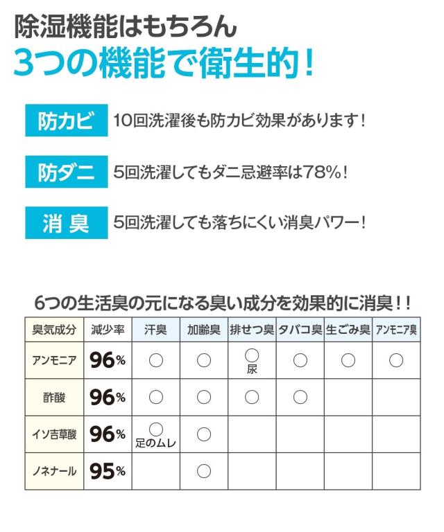 除湿シートに防カビ・防ダニ・消臭の3つ機能を付けた1クラス上のシートです。