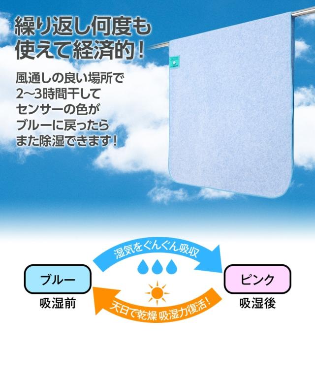 睡眠時には1晩にコップ約1〜2杯分の汗をかいているといわれています。また梅雨時の湿気や夏の汗、冬は結露など家の中は意外に湿気が多いもの。このシートを使えばジメジメ湿気をサラッと除湿してくれます。●防ダニ・消臭・防カビ機能もついているのでさらに安心です。●除湿センサー付き!シートが湿気を吸ってセンサーがピンクになれば風通しの良い場所に干すことで元に戻ります。また、何度も使えて経済的!●敷布やマットレスの下はもちろん、カーペットの下や押入れなど家中の湿気やすい場所で大活躍! お財布にやさしいお値段なので、いろんな場所に置いてください! ジメジメとサヨナラしてサラッと気持ちよくお過ごしいただけます。