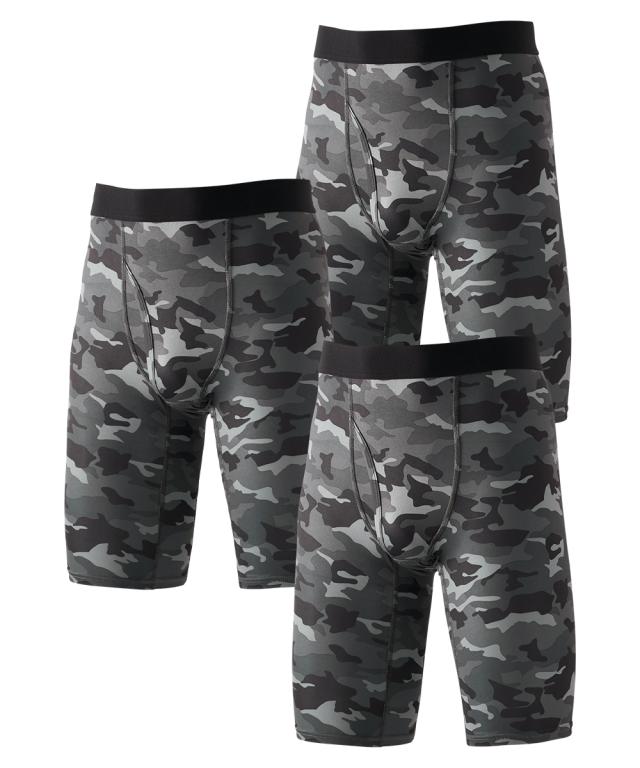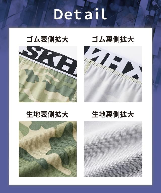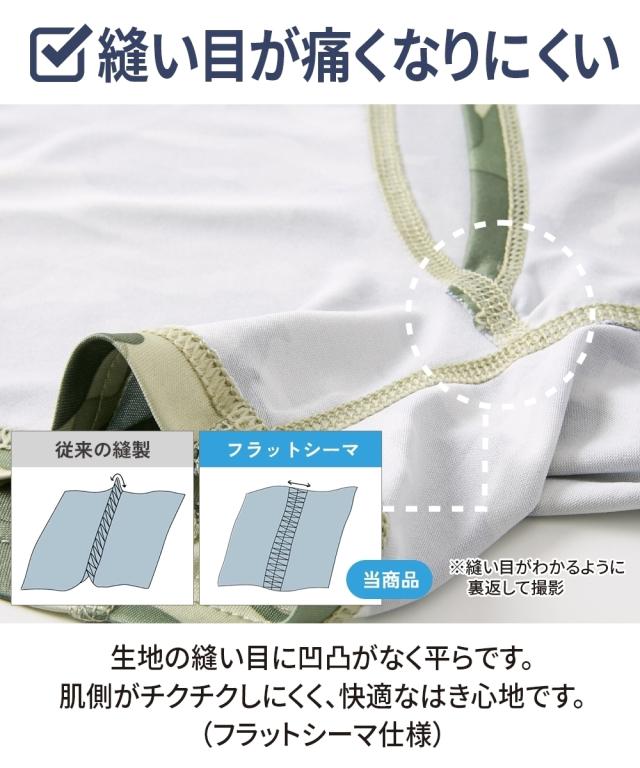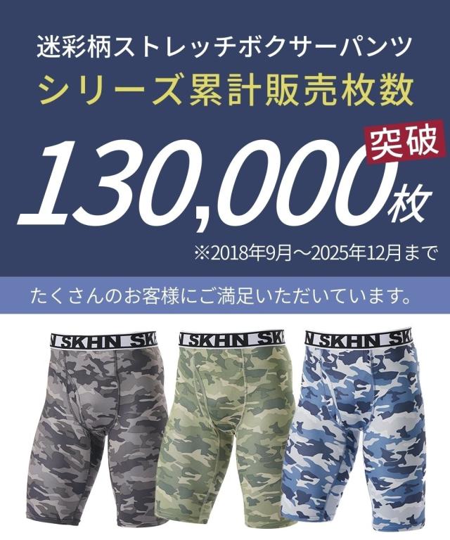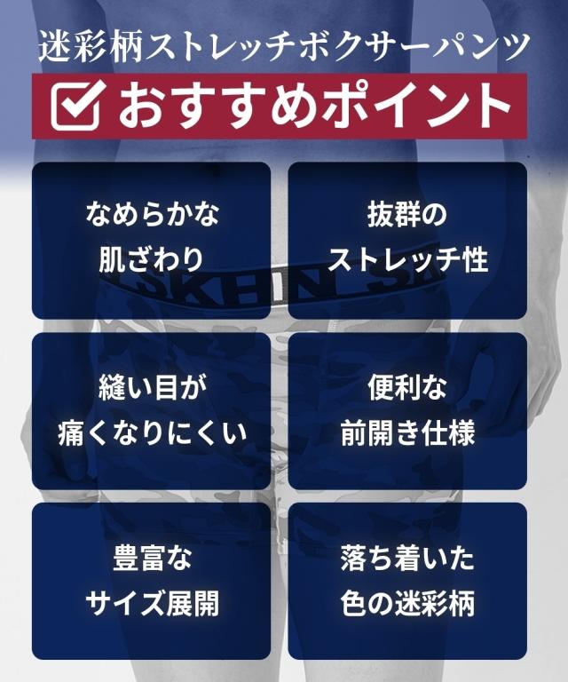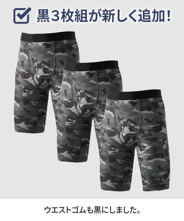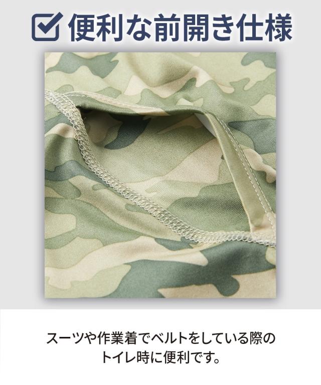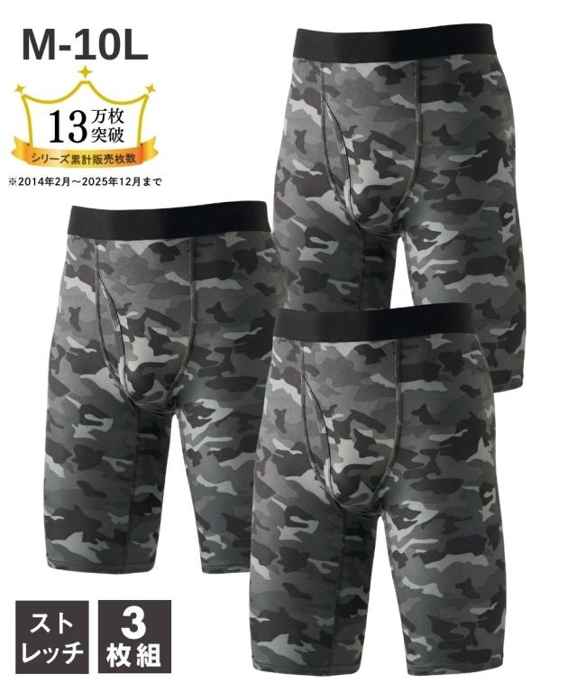 シリーズ累計販売枚数12万枚突破!クールな迷彩柄にウエストゴムがアクセントになった前開きロングボクサーパンツ 〜おすすめポイント〜 ■なめらかな肌ざわり ツルツルしたすべりがよい生地を使用。 ボトムがするっと着用でき、一度はいたらやみつきになる気持ちよさです。 ■抜群のストレッチ性 伸縮性があり、よく伸びます。 体の動きにフィットするから気持ちよくご着用していただけます。 ■縫い目が痛くなりにくい 生地の縫い目に凹凸がなく平らです。 肌側がチクチクしにくく、快適なはき心地です。(フラットシーマ仕様) ■便利な前開き仕様 スーツや作業着でベルトを着用している際のトイレ時に便利です。 ■M〜10Lの全9サイズ展開 たくさんの人に着用して欲しいから全9サイズをご用意しました。 あなたにぴったりのサイズが必ずあります。 ■落ち着いた色の迷彩柄 派手すぎず、地味すぎない落ち着いた色の迷彩柄 年齢を問わずご着用いただけます。 ■便利なセット組 毎日履いて欲しいからセット組でお届けします。 出張や旅行の際にも便利です。
