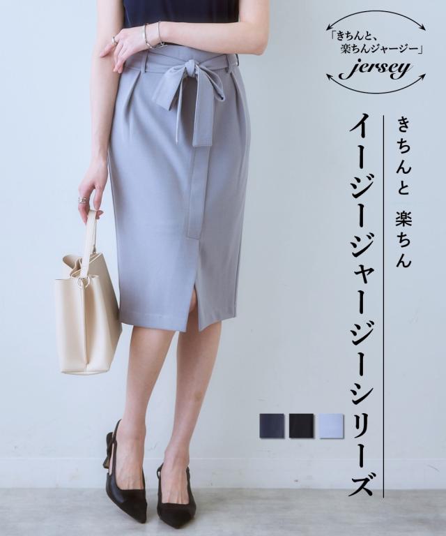 スカート ひざ丈 レディース ジャージ ーシリーズ カットソー ラップ風タイト サッシュ ベルト 付 セットアップ 対応 オフィス スーツ M/L/LL ニッセン nissen