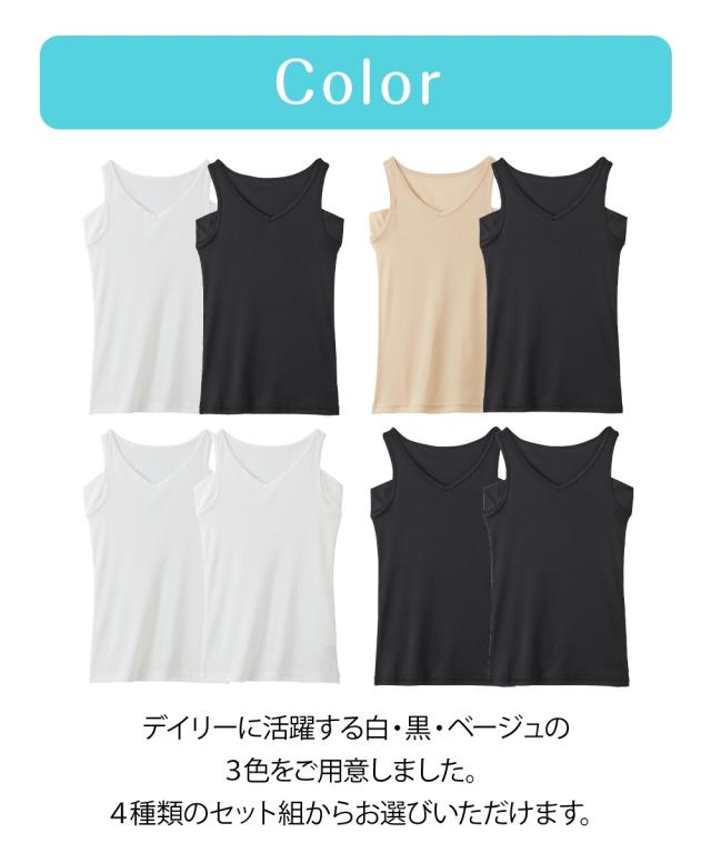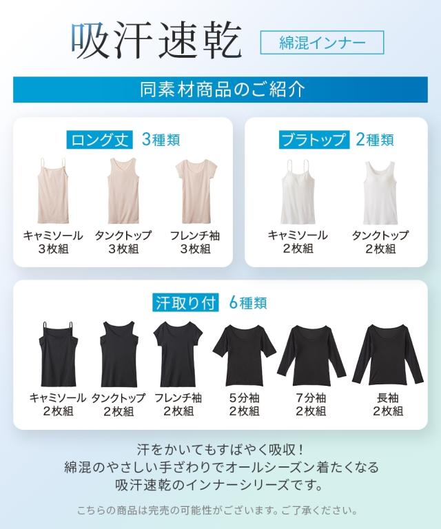 [keyword] 下着 ランジェリー インナー 大きいサイズ レディース 標準サイズ 普通サイズ ゆったりサイズ プラスサイズ 汗取りパッド付き 脇汗対策 吸汗速乾 乾きやすい 綿混 素材 お買い得セット まとめ買い セット お得 [comment]【吸汗速乾 綿混汗取り付タンクトップ2枚組】ー 吸汗速乾 綿混インナー シリーズ累計販売枚数 18万枚 突破!! ー (※) 吸汗速乾素材を使用した、オールシーズン着られる快適インナーです! 汗をすばやく吸収し、サラッとした着心地のタンクトップ。 汗取りパッドが付いているのでアウターへの汗ジミを防ぎます。 シンプルなデザイン、セット組でのお届けなので普段使いに最適です。 \こんな方におすすめ/ ・快適に着られるインナーがほしい ・年中汗っかきなので肌着選びが難しい ・脇の汗ジミが気になる ・毎日使いできるインナーがほしい ・セット組でお得な買い物がしたい \おすすめポイント/ ■吸汗速乾 汗をかいてもすばやく吸収してくれる吸汗速乾素材を使用。 快適な着心地なので、毎日着たくなる♪ 綿混生地なので手ざわりがよく、肌にやさしいのもうれしいポイントです。 ■汗取りパッド付 脇汗対策にかかせない汗取りパッド付! 夏はもちろ