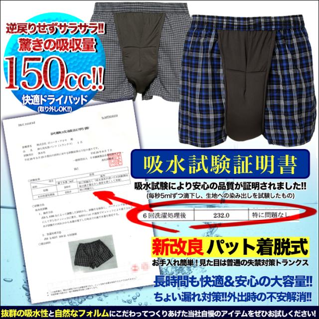 尿もれパンツ 失禁パンツ 2枚組 メンズ 送料無料 介護下着 トランクス 吸収量150cc 全2色 送料無料 パット交換タイプ ts-n-2