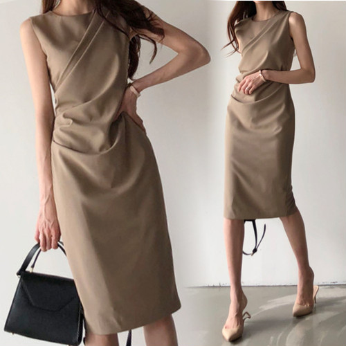 LAZA 【ブラウン/フリーサイズ】 フロントクロス ノースリーブ ワンピース ドレス シンプル エレガント ひざ丈 上品 きれいめ
