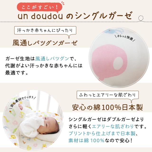素材は赤ちゃんのお肌に優しい綿100%を使用。シングルガーゼなのでお洗濯後の乾きも早く、気軽にお洗濯ができます。