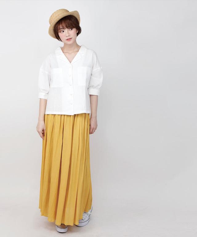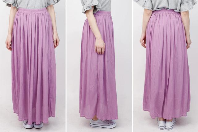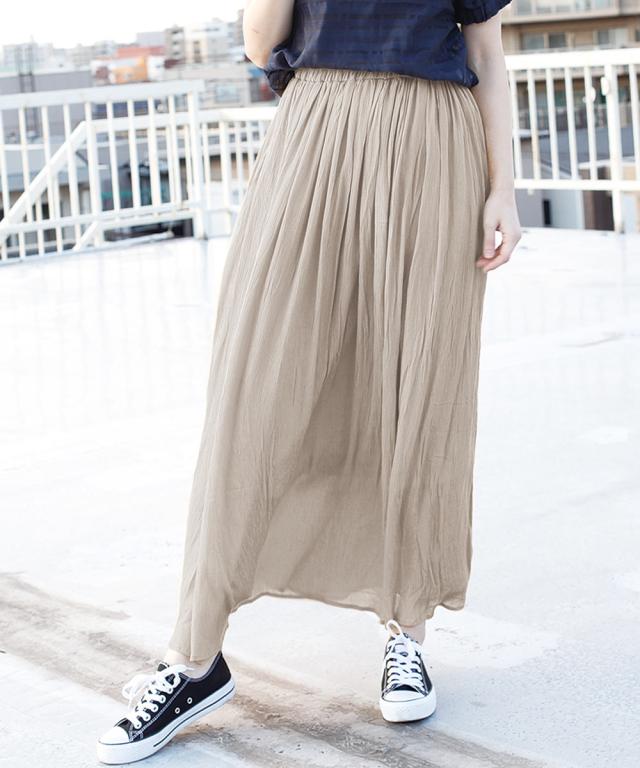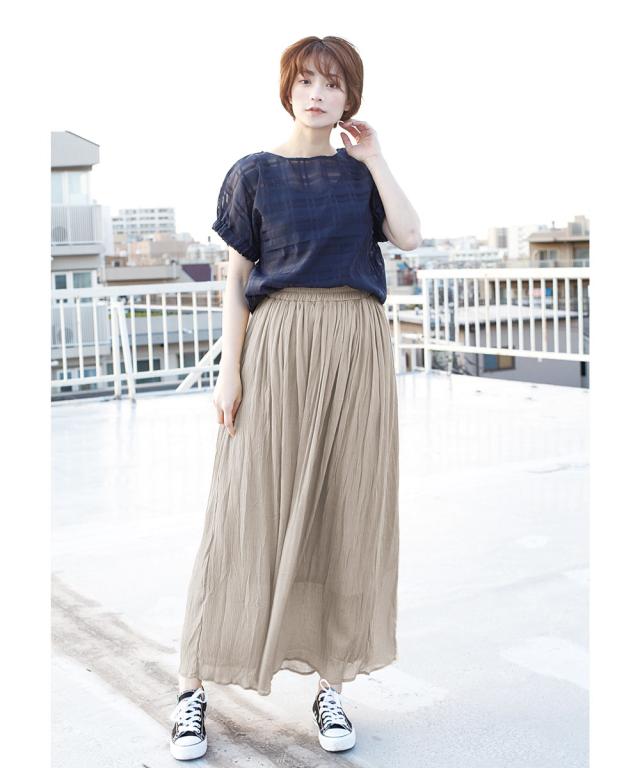 表面にシボ感のある楊柳生地を使った、マキシ丈のフレアスカート。さらっとした軽やかな生地だから、