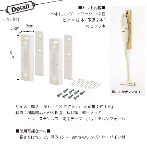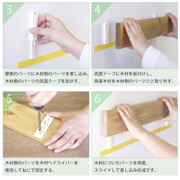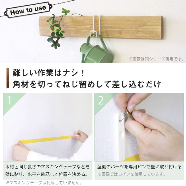石膏ボードや木壁で使用でき、好みの材質・サイズの木材を、ねじやピンで簡単に取り付けられます。