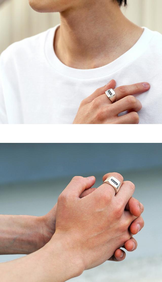 ブランド名を人気のボックスロゴデザインで、印台リングの中心に刻印したシルバーリング。鏡面仕上げされたリング本体に、燻し加工が施されたロゴがアクセントになっています。シンプルながら目を惹くデザインのアイテムです。