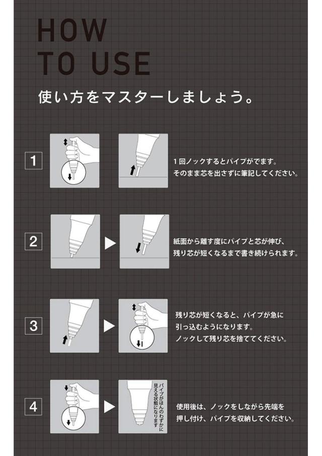 【2】紙面から離す度にパイプと芯が伸び、残り芯が短くなるまで書き続けられます。