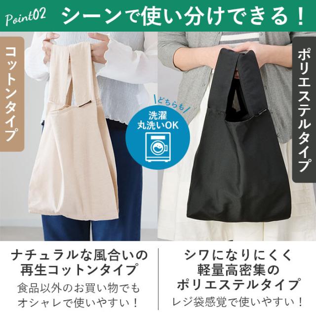 | 商品説明 | ・レジ袋と同じ形で、スーパーやコンビニで買ったお惣菜やお弁当などもすっぽりと入れやすいデイリーエコバッグ! ・上部のマチが約19cm!かさばりがちな野菜や果物など、コンパクトな見た目以上に食材がしっかりと入るので、日々のお買い物で大活躍。 ・持ち手の生地が幅広にデザインされていて、少し多めにお買い物をした日も手が痛くなりにくい。 ・使わない時にはくるっとまるめてゴムバンドで止めれば、コンパクトな手のひらサイズに!通勤用のカバンにも入れておける♪ ・光沢感のある手触りのよいポリエステル生地。お洗濯もカンタン。 ・シンプルでおしゃれなカラーバリエーションも魅力!レジ袋よりもオシャレで、普段からカバンに入れて持ち歩けばエコに協力できる♪ |