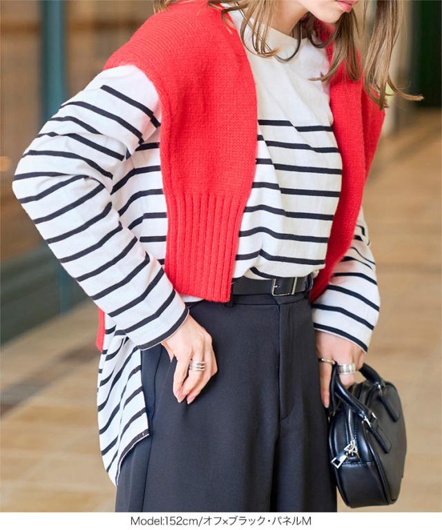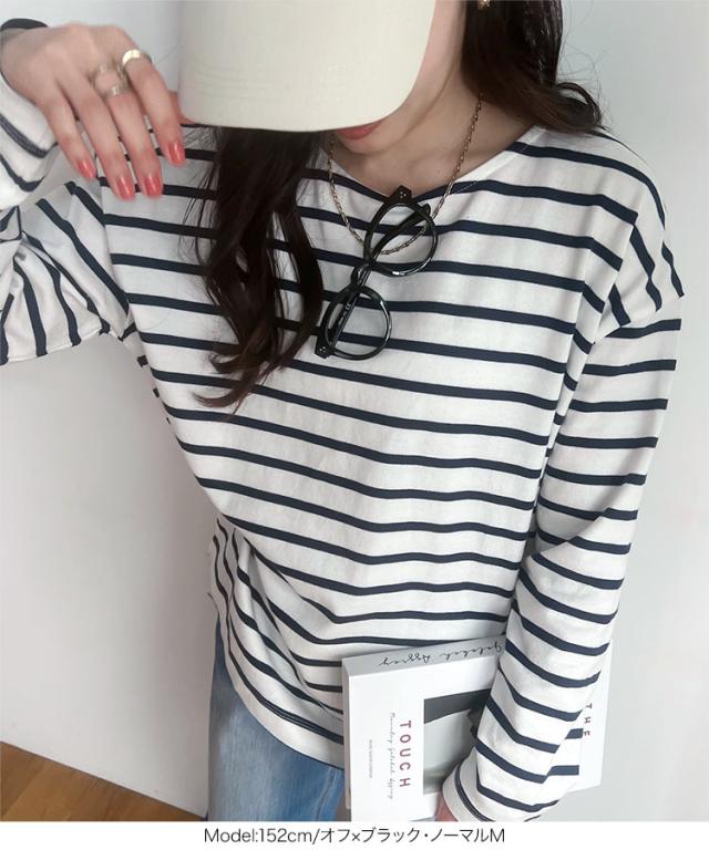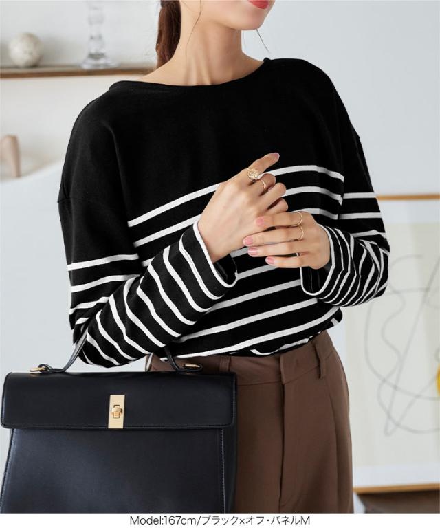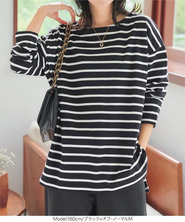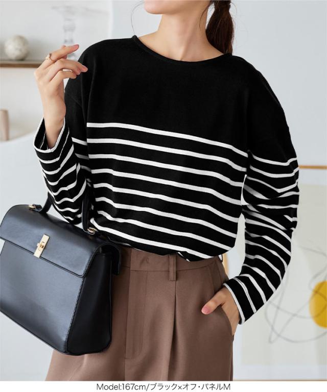 定番人気のボーダートップス。カジュアルながらも広めのネックラインで女性らしい着こなしが叶います。肩の落ちたデザインで大人なこなれ感を演出。