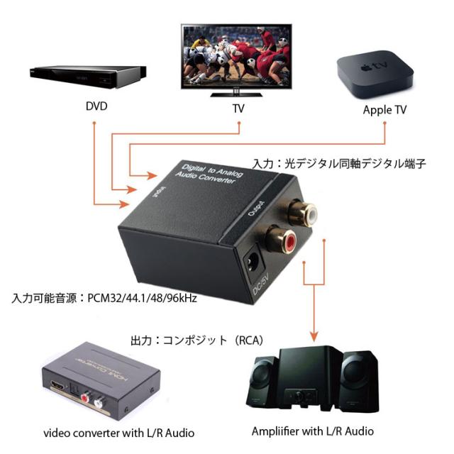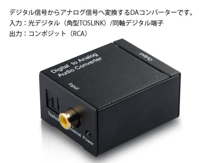 光 、同軸 (デジタル) から入力された音声信号を RCA (アナログ) に変換します。