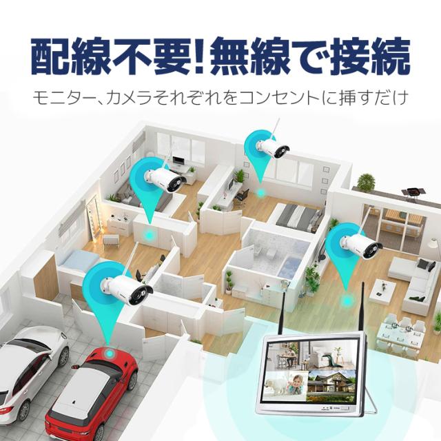 ワイヤレス防犯システム 12インチモニター付きワイヤレスNVR+ワイヤレスカメラ1台 ワイヤレス防犯カメラセット 屋内・屋外両用 WF6111