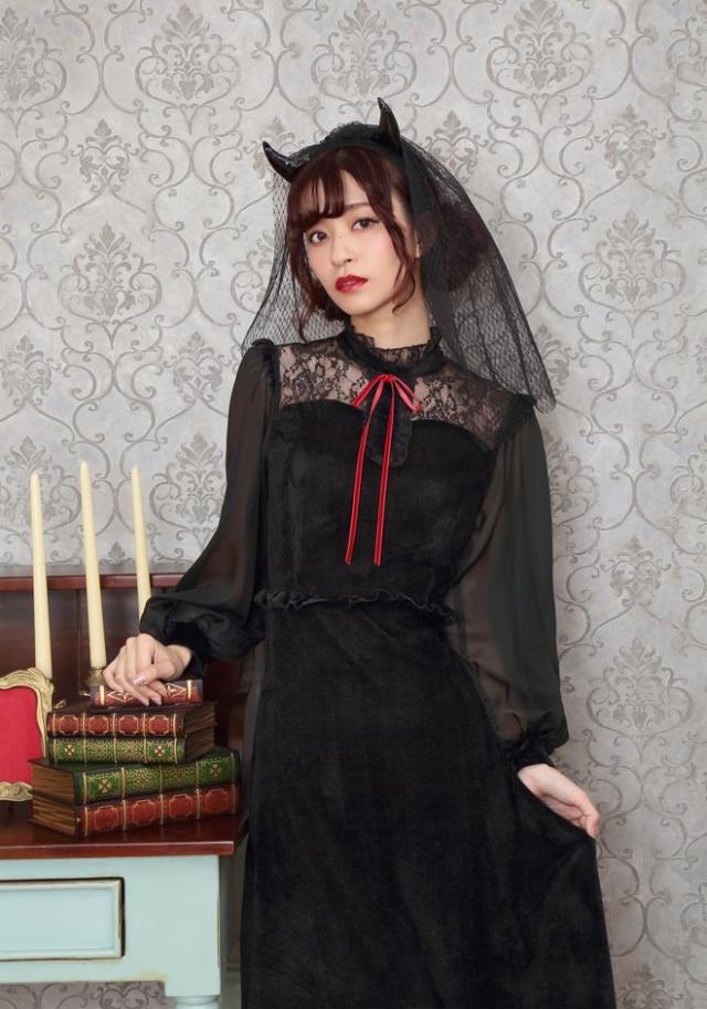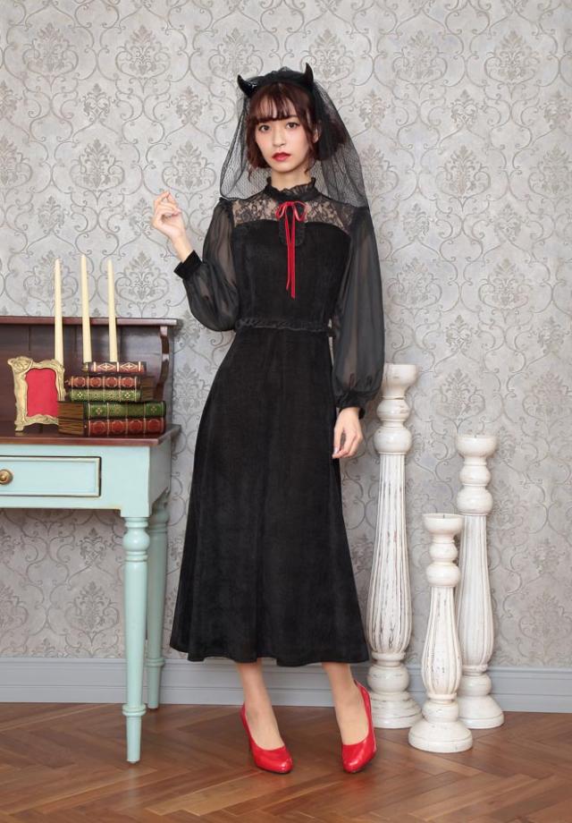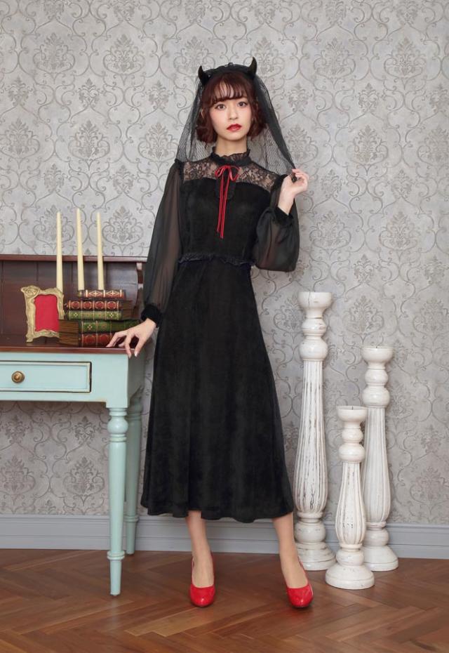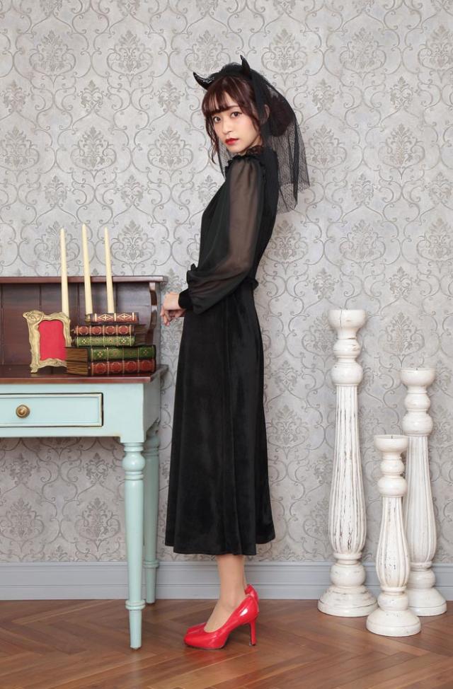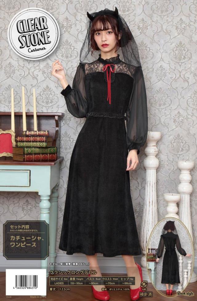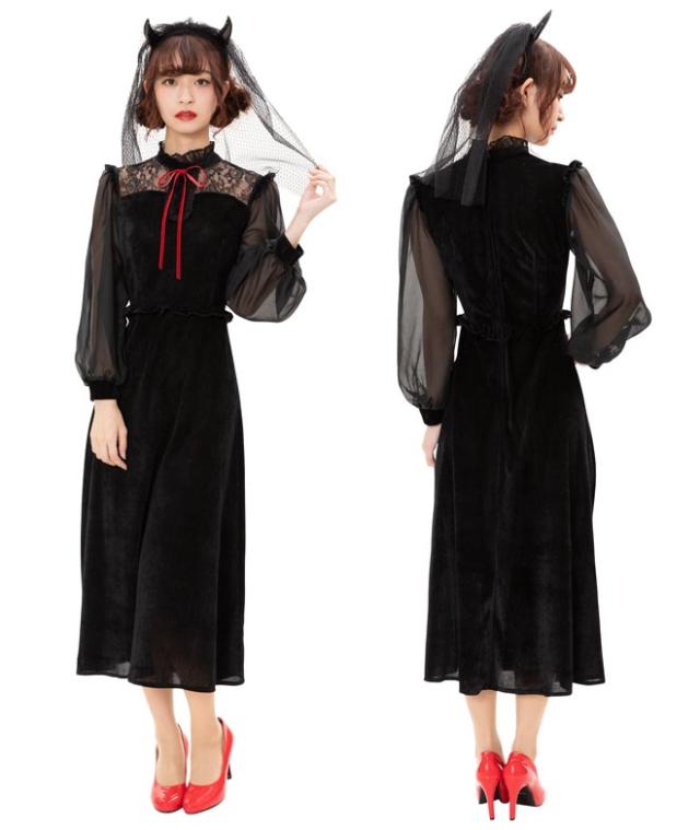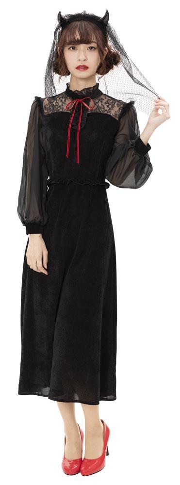 ブラックカラーとロング丈がクラシカルな印象。ヴェール付きデビルカチューシャや胸元のレース、シースルーの袖もエレガントポイント。ウエストのフリルで脚長効果も!コスプレ初心者やママにもおすすめ!
