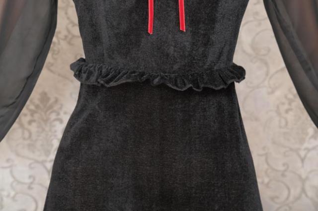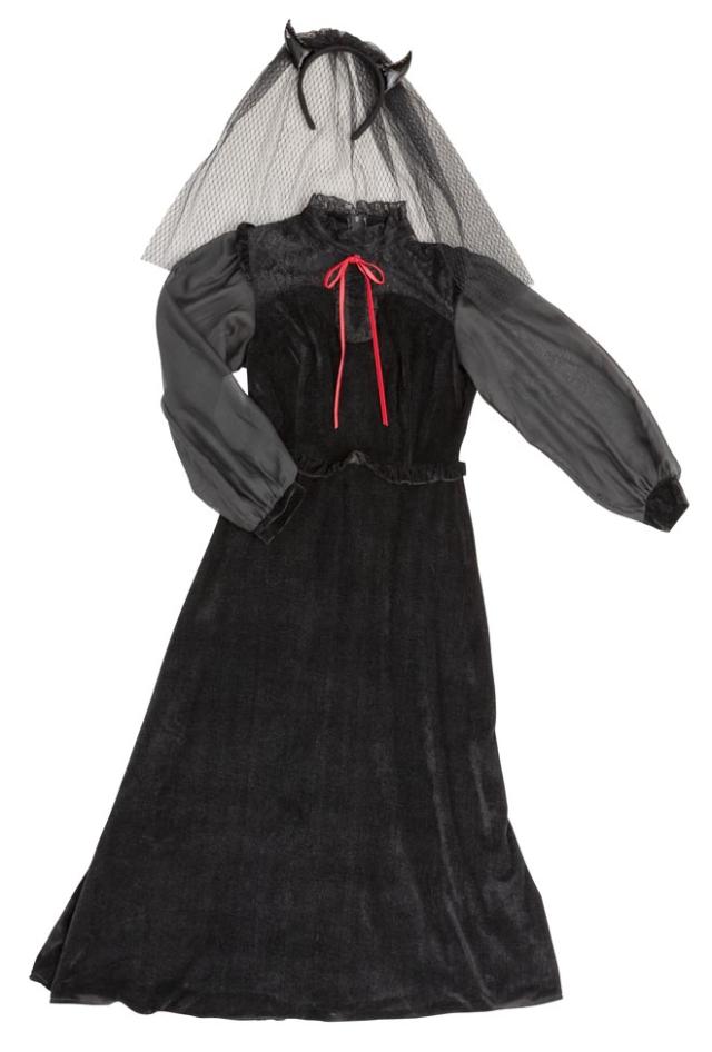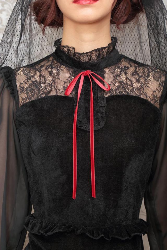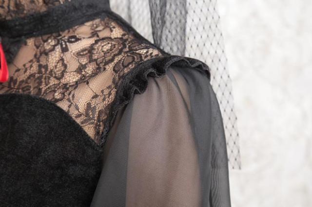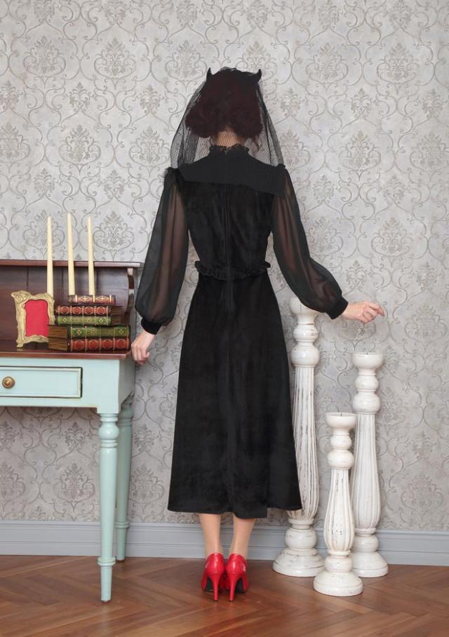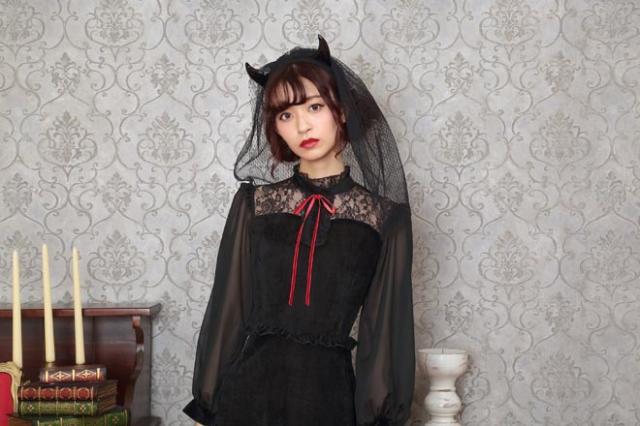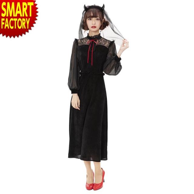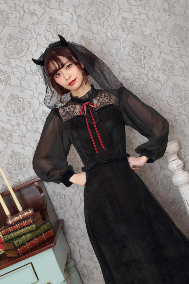 ブラックカラーとロング丈がクラシカルな印象。ヴェール付きデビルカチューシャや胸元のレース、シースルーの袖もエレガントポイント。ウエストのフリルで脚長効果も!コスプレ初心者やママにもおすすめ!