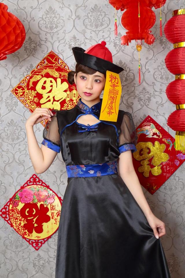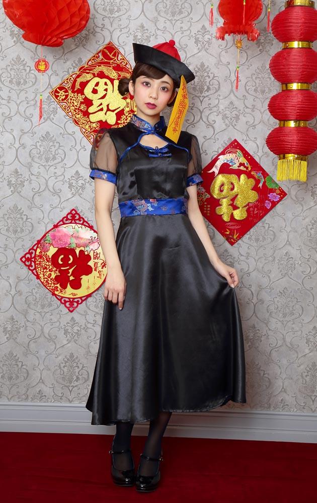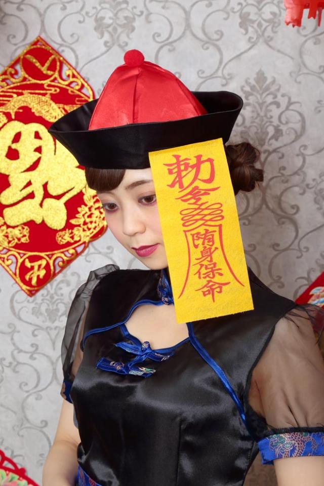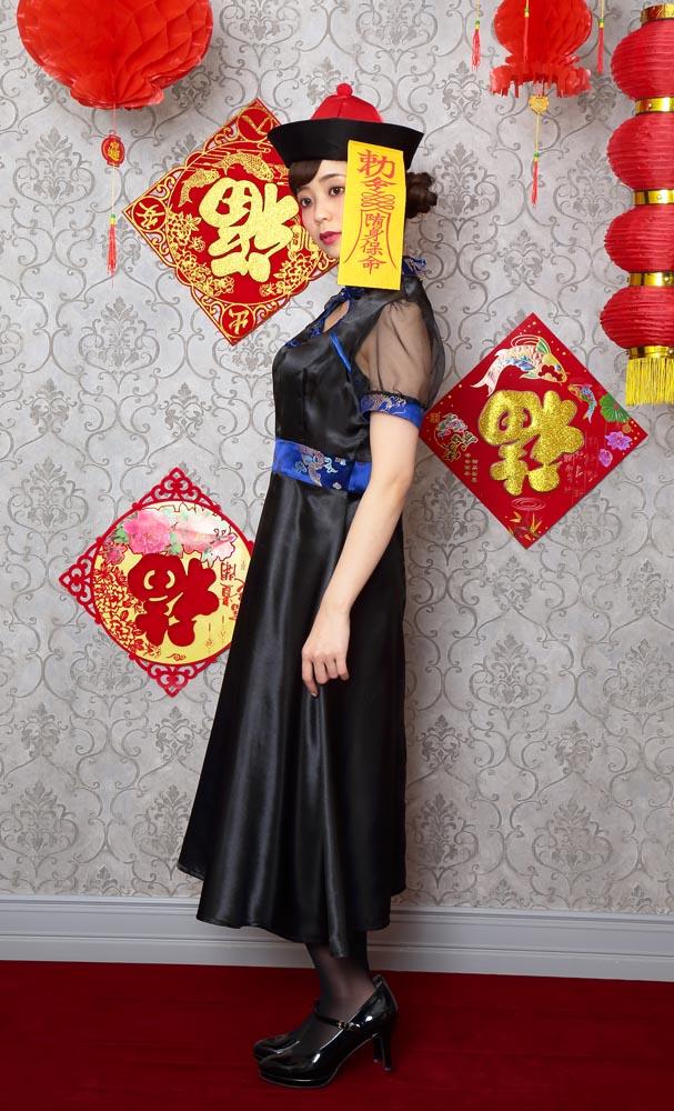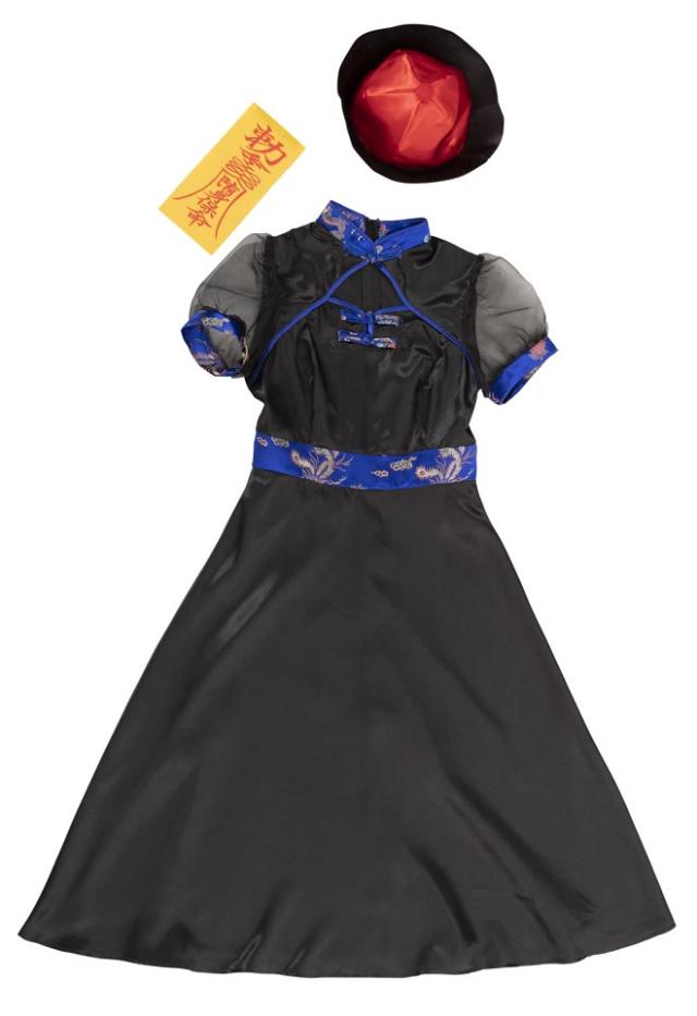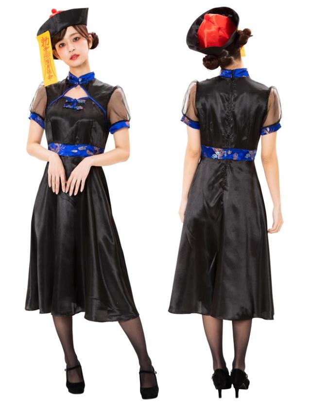 妖怪キョンシーコスチューム。露出が気になる方でも大人っぽく着られるロング丈。胸元も程良い空き具合でセクシーになりすぎません。柄入りのチャイナボタンもエレガント。袖はオーガンジー素材のパフスリーブデザイン。帽子のお札は取り外し可能。