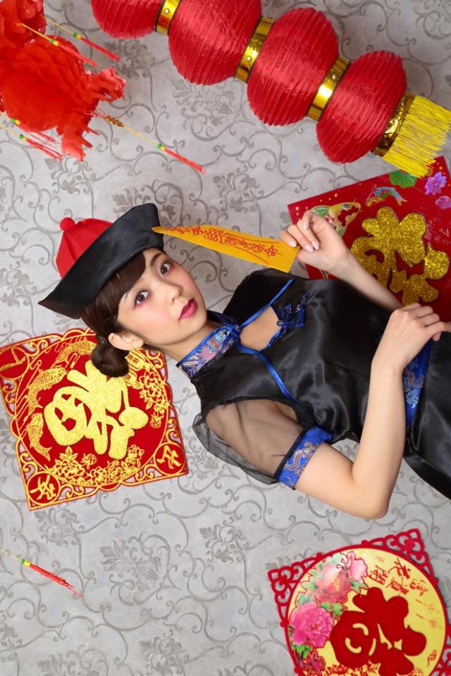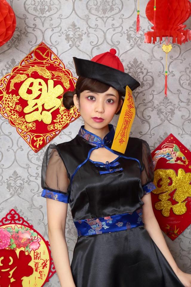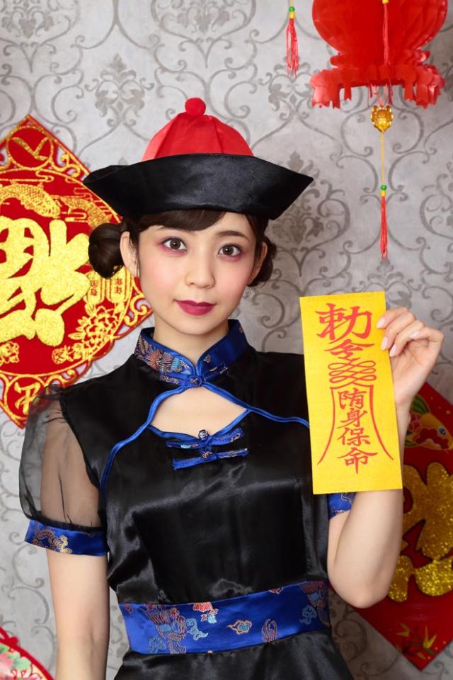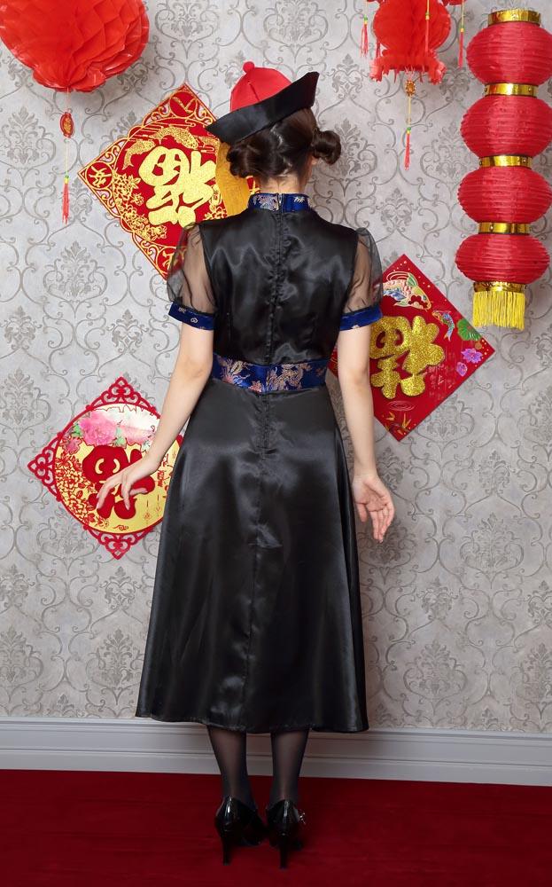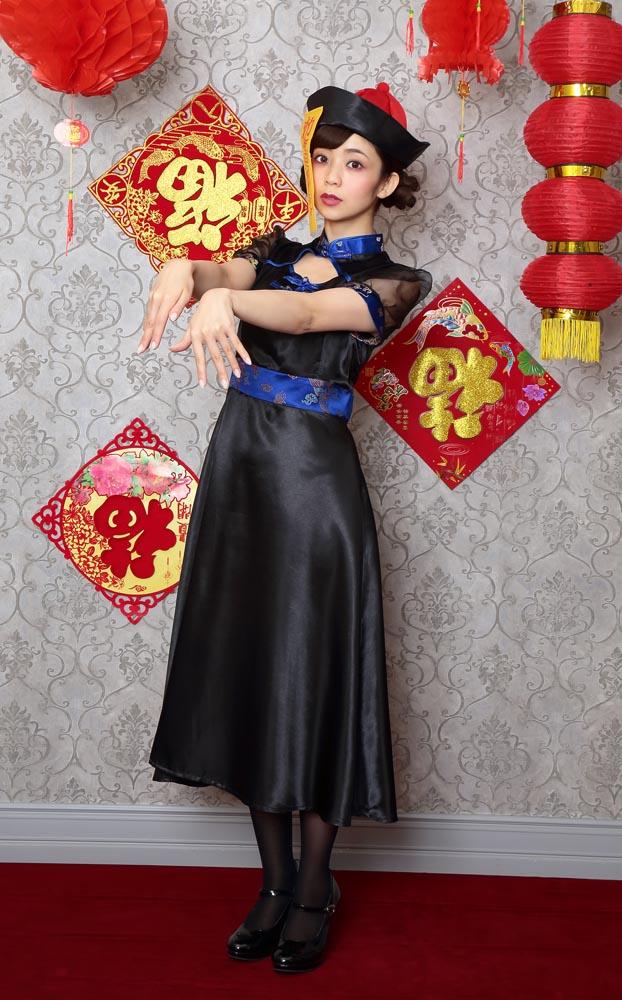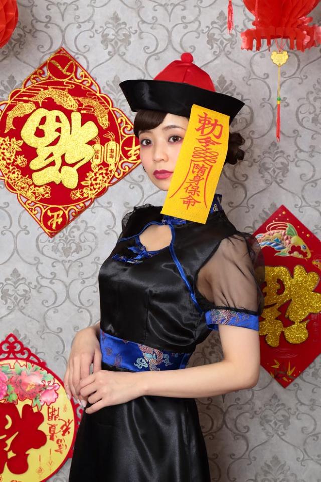 妖怪キョンシーコスチューム。露出が気になる方でも大人っぽく着られるロング丈。胸元も程良い空き具合でセクシーになりすぎません。柄入りのチャイナボタンもエレガント。袖はオーガンジー素材のパフスリーブデザイン。帽子のお札は取り外し可能。