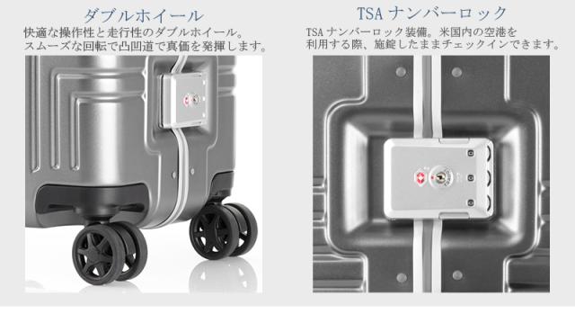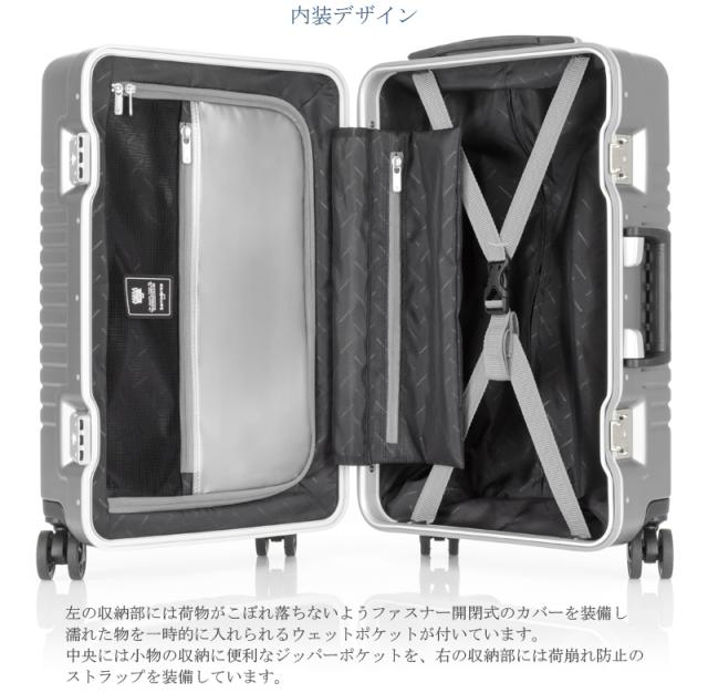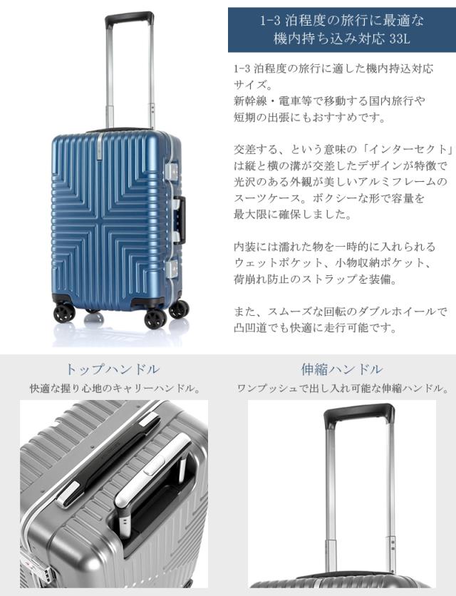 1-3泊程度の旅行に適した機内持込対応サイズ。新幹線・電車等で移動する国内旅行や短期の出張にもおすすめです。交差する、という意味の「インターセクト」は縦と横の溝が交差したデザインが特徴で光沢のある外観が美しいアルミフレームのスーツケース。ボクシーな形で容量を最大限に確保しました。内装には濡れた物を一時的に入れられるウェットポケット、小物収納ポケット、荷崩れ防止のストラップを装備。また、スムーズな回転のダブルホイールで凸凹道でも快適に走行可能です。