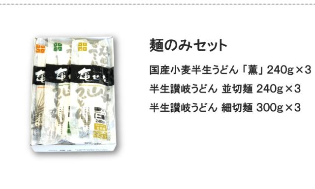 3.麺のみセット:国産小麦半生うどん 「薫」 240g×3、半生讃岐うどん 並切麺 240g×3、半生讃岐うどん 細切麺 300g×3