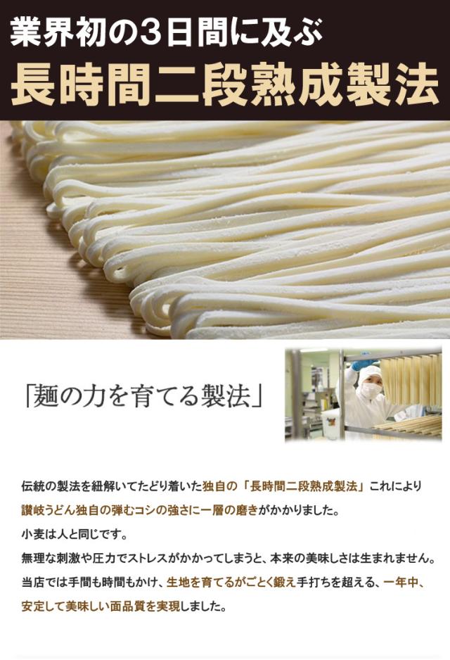 ■商品詳細:生地を傷めないように鍛え、22時間にも及ぶ長時間二段熟成を行うことで従来の讃岐うどんと比べて、キレイなイカ刺しのような輝く透明感の麺を作っています。