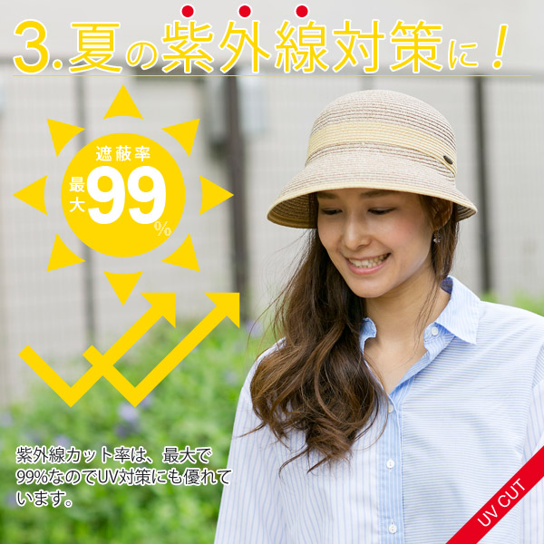 今までは、洗濯機で丸洗いできるハットが少なかったのですがアクリルファイバーに特殊加工を施した型崩れしにくい速乾素材を使用することによりホームウォッシュを可能としました。クロッシェとは、ベルのような形をしたクラウン部分が深く、つば部分が短めに作られた帽子です。リボンは巻かずにフチ部分と同系色の切替になっているデザインで、どんな場面ででも活躍してくれそうな女性らしいシンプルなハット。また、折りたたむことも出来るので、型崩れを気にせずバックに収納して持ち運べます。紫外線対策にも効果を発揮し、遮蔽率は99%以上!さらにスベリの内側にサイズ調整用のマジックテープ付。