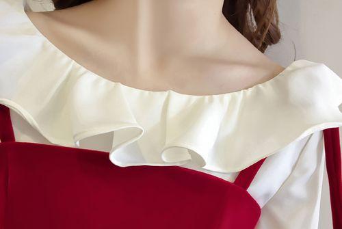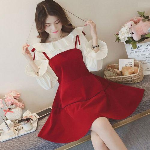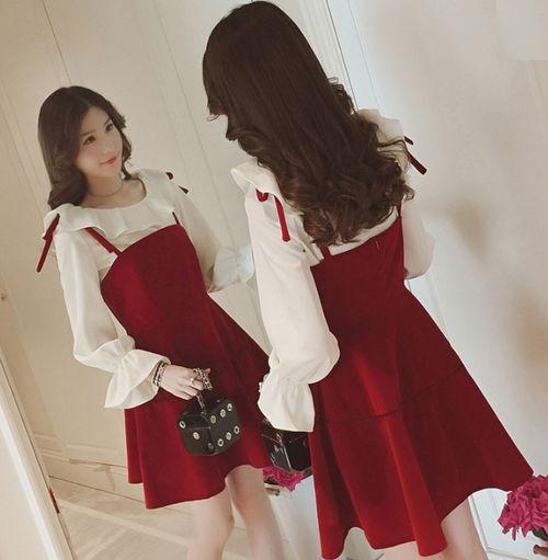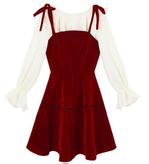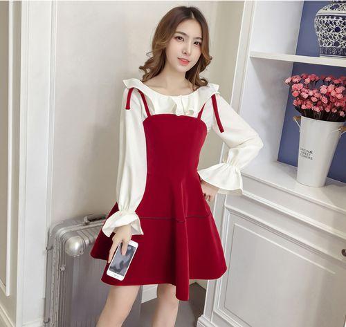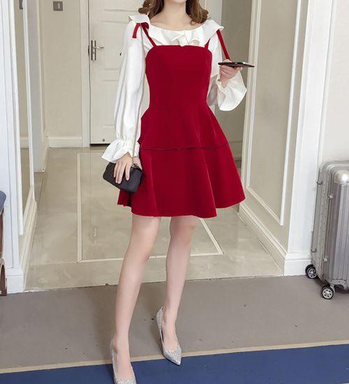 秋のワンピース 秋 レディース 秋 トップス ワンピース ストラップ フレア カットソー トップス フリル 長袖 ミニ丈 可愛い 赤 無地 フェミニン お出掛け デート 女子会 メルヘン レディース ジャンパースカート