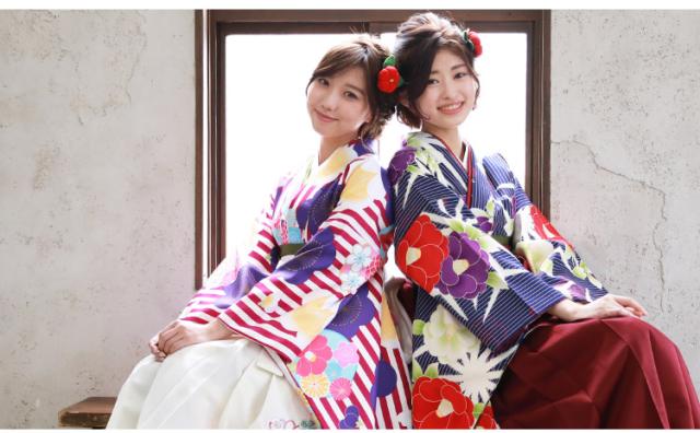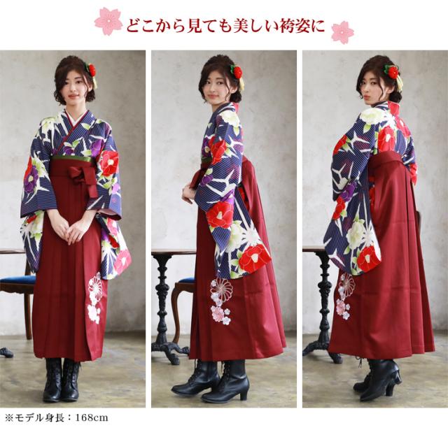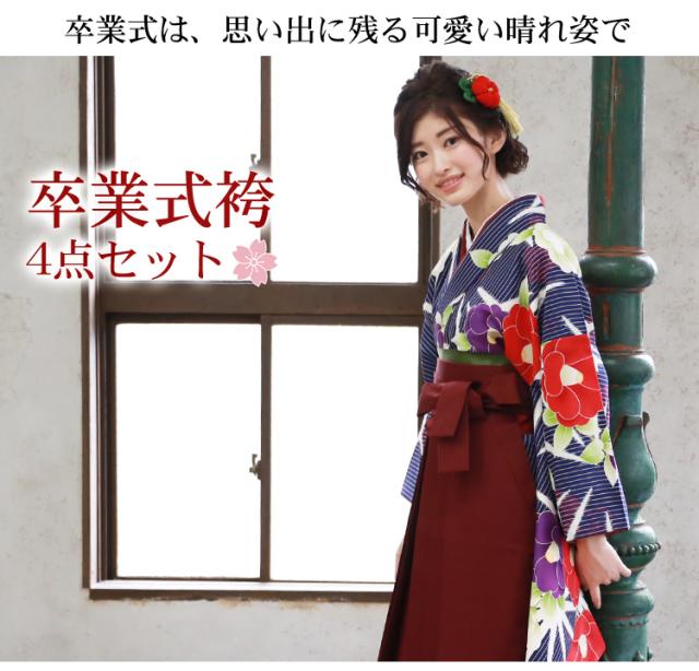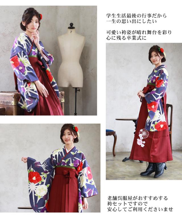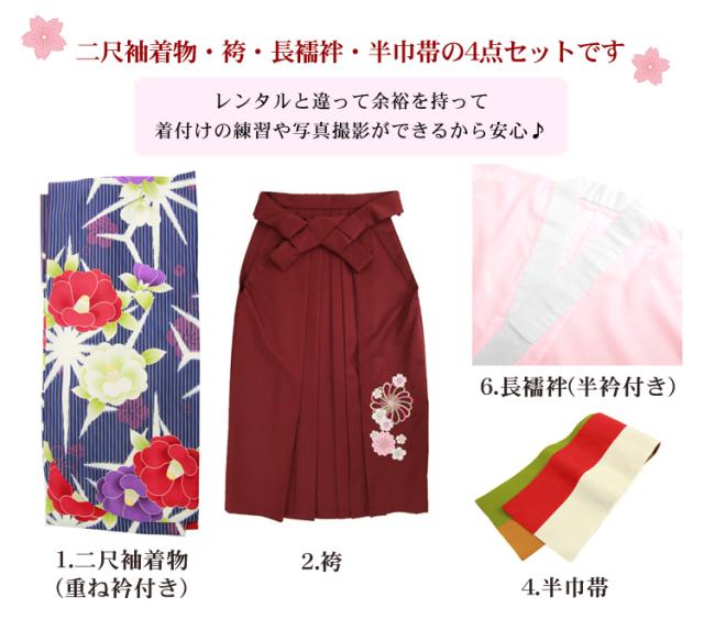 〔zu〕販売 卒業式 袴 4点セット 購入 女性 袴セット 卒業式袴セット 2尺袖着物 袴 長襦袢 半巾帯「紺地に白縞と赤・紫・白の椿」
