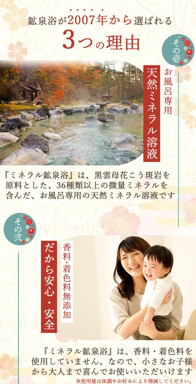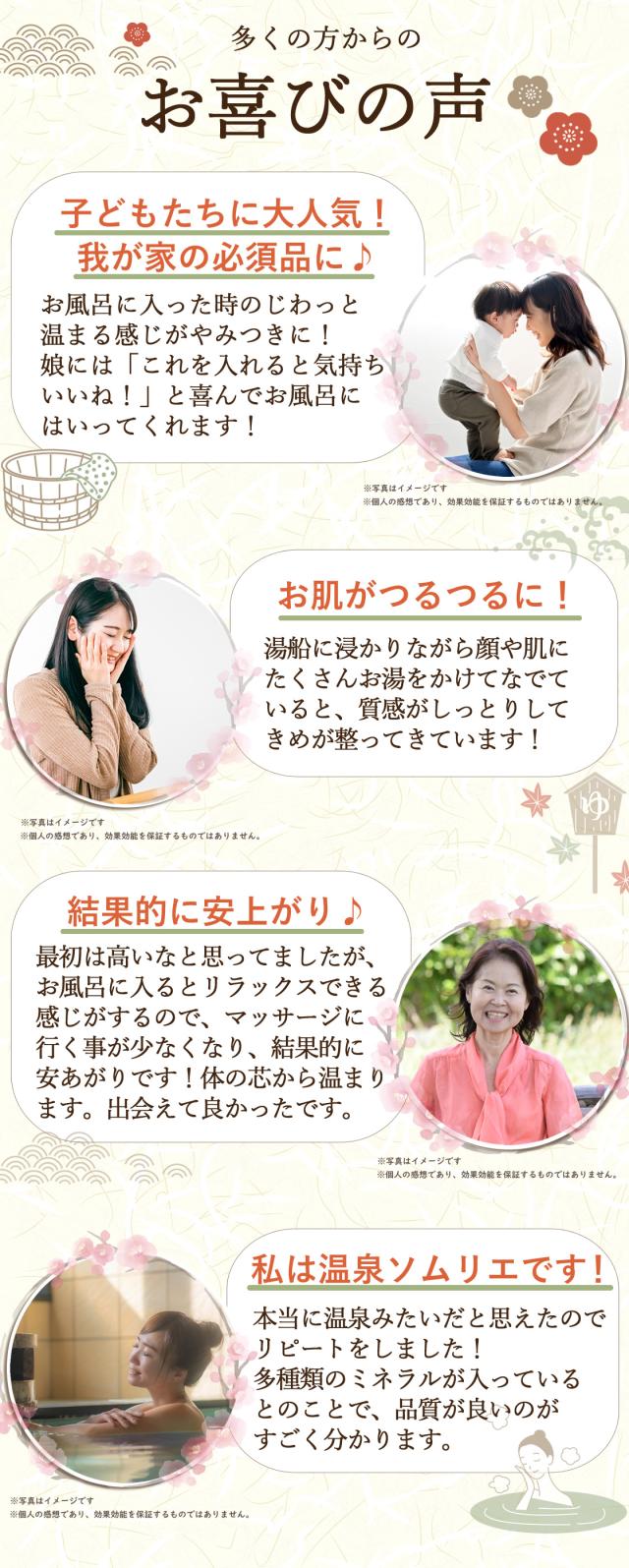 この“ミネラル鉱泉浴”は36種類以上のバランスの取れた鉱物ミネラルの天然成分のみ(無着色・無香料)で作られております。