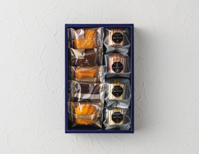 ●内容:トリュフケーキ×2・ガトー・オ・マロン×2・マドレーヌ×1・フィナンシェ×1・フィナンシェ・ショコラ×1、ヌーヴェルガレット(バニラ・チョコ)×各1